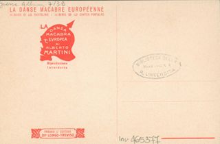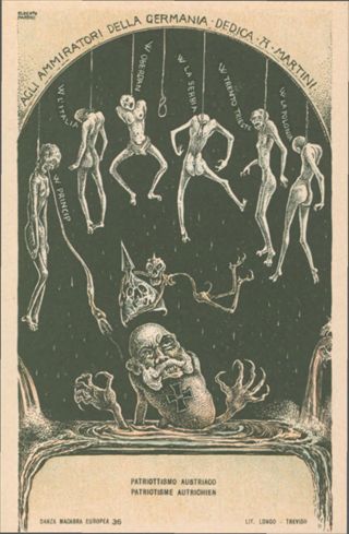 Note: Titolo in calce all'illustrazione in italiano e in francese. - Data di pubblicazione dalla prima illustrazione della serie; cfr. Danza macabra europea. La tragedia della grande guerra nelle 54 cartoline litografate, Genova, Le mani, 2008. - Nell'illustrazione Oppositori italiani all'Austria impiccati su cui campeggia la scritta Agli ammiratori della Germania dedica A. Martini