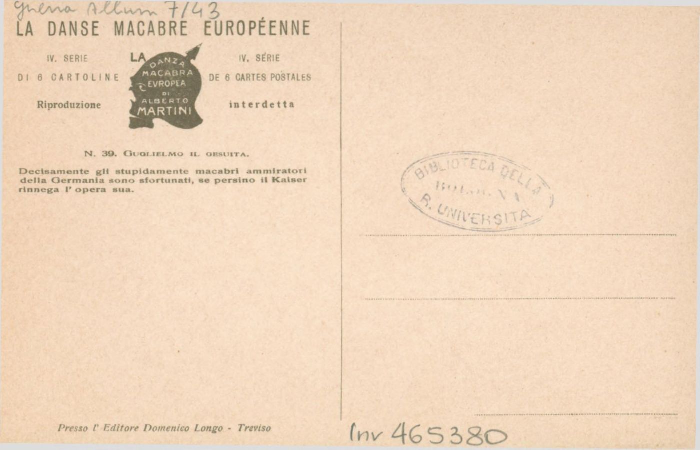 Descrizione: Guglielmo il gesuita / Alberto Martini. - Treviso: Longo, [1915]. - 1 cartolina illustrata: litografia, color. ; 140x90 mm.