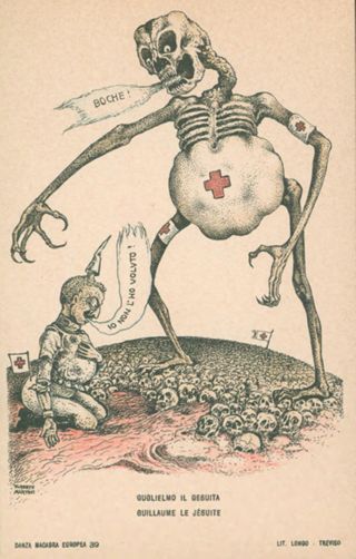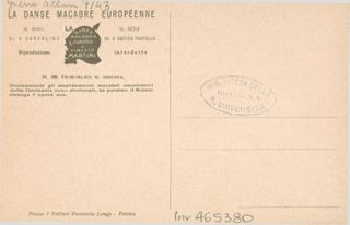 Note: Titolo in calce all'illustrazione in italiano e in francese. - Per la data di pubblicazione cfr.: Danza macabra europea. La tragedia della grande guerra nelle 54 cartoline litografate, Genova, Le mani, 2008. - Sul verso didascalia: Decisamente gli stupidamente macabri ammiratori della Germania sono sfortunati, se persino il Kaiser rinnega l'opera sua