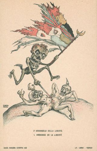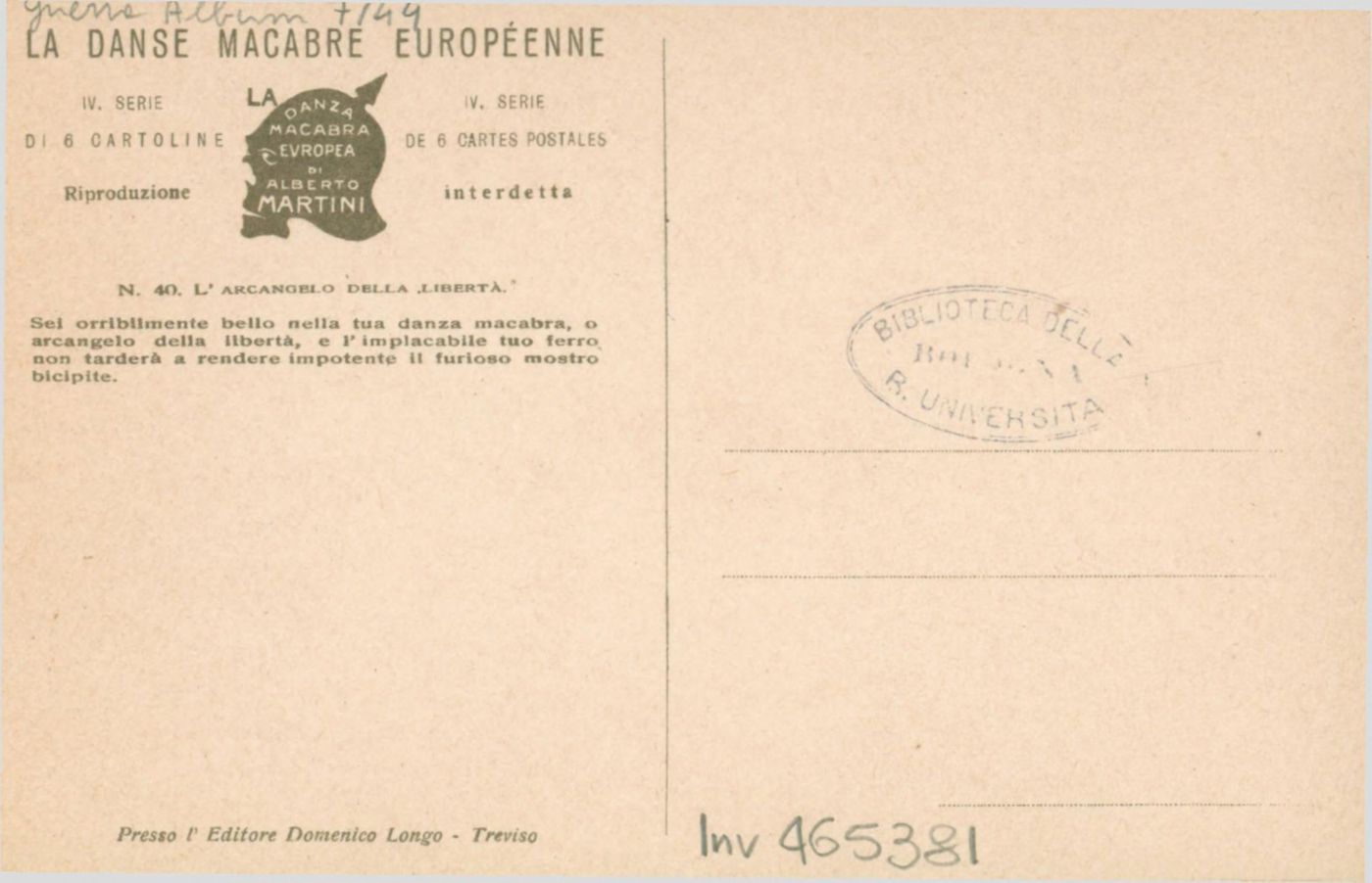 Note: Titolo in calce all'illustrazione in italiano e in francese. - Per la data di pubblicazione cfr.: Danza macabra europea. La tragedia della grande guerra nelle 54 cartoline litografate, Genova, Le mani, 2008. - Sul verso didascalia: Sei orribilmente bello nella tua danza macabra, o arcangelo della libertà, e l'implacabile tuo ferro non tarderà a rendere impotente il furioso mostro bicipite