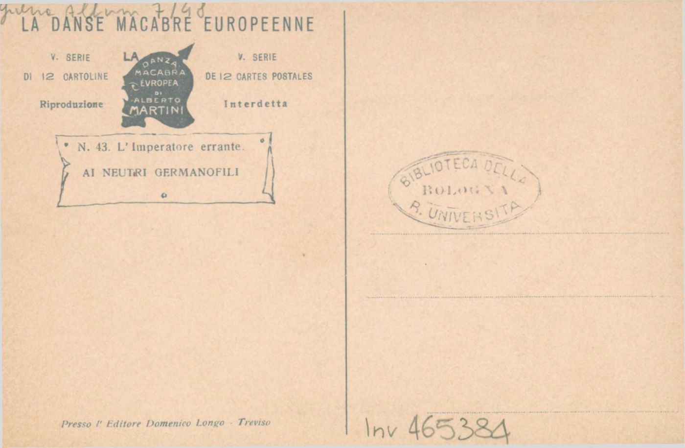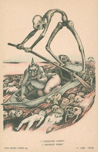 Descrizione: L'imperatore errante / Alberto Martini. - Treviso: Longo, 1915. - 1 cartolina illustrata: litografia, color. ; 140x90 mm.
