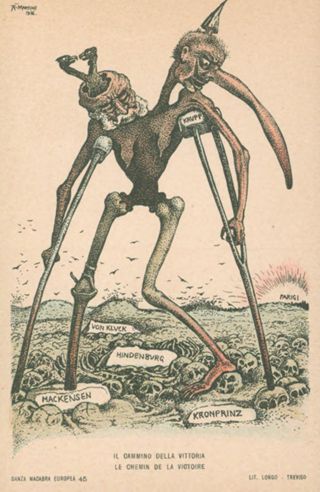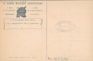 Note: Titolo in calce all'illustrazione in italiano e in francese. - Data sull'illustrazione. - Sul verso didascalia: Agli ammiratori della Germania. - Nell'illustrazione Francesco Giuseppe 1. d'Austria e Guglielmo 2. di Germania camminano sostenendosi a vicenda su una distesa di teschi