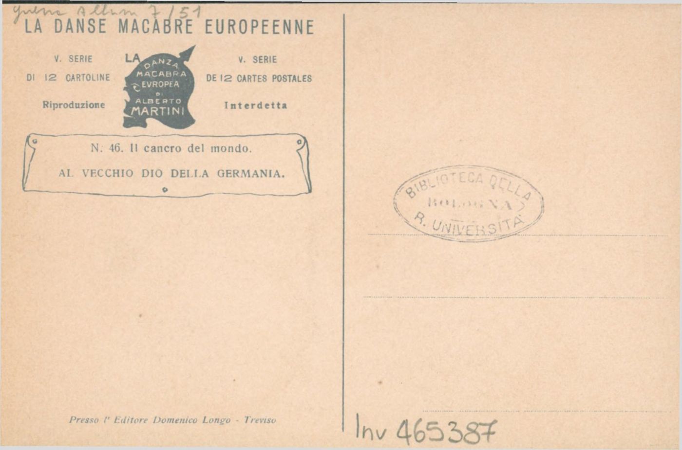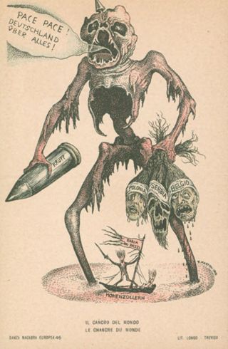 Descrizione: Il cancro del mondo / A. Martini. - Treviso: Longo, 1915. - 1 cartolina illustrata: litografia, color. ; 140x90 mm.