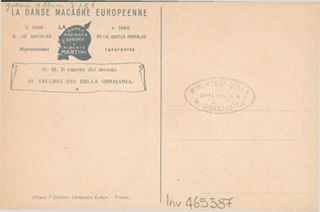 Note: Titolo in calce all'illustrazione in italiano e in francese. - Data sull'illustrazione. - Sul verso didascalia: Al vecchio dio della Germania. - Nell'illustrazione La morte col capo chiodato tiene in mano le teste mozzate di Polonia, Serbia e Belgio