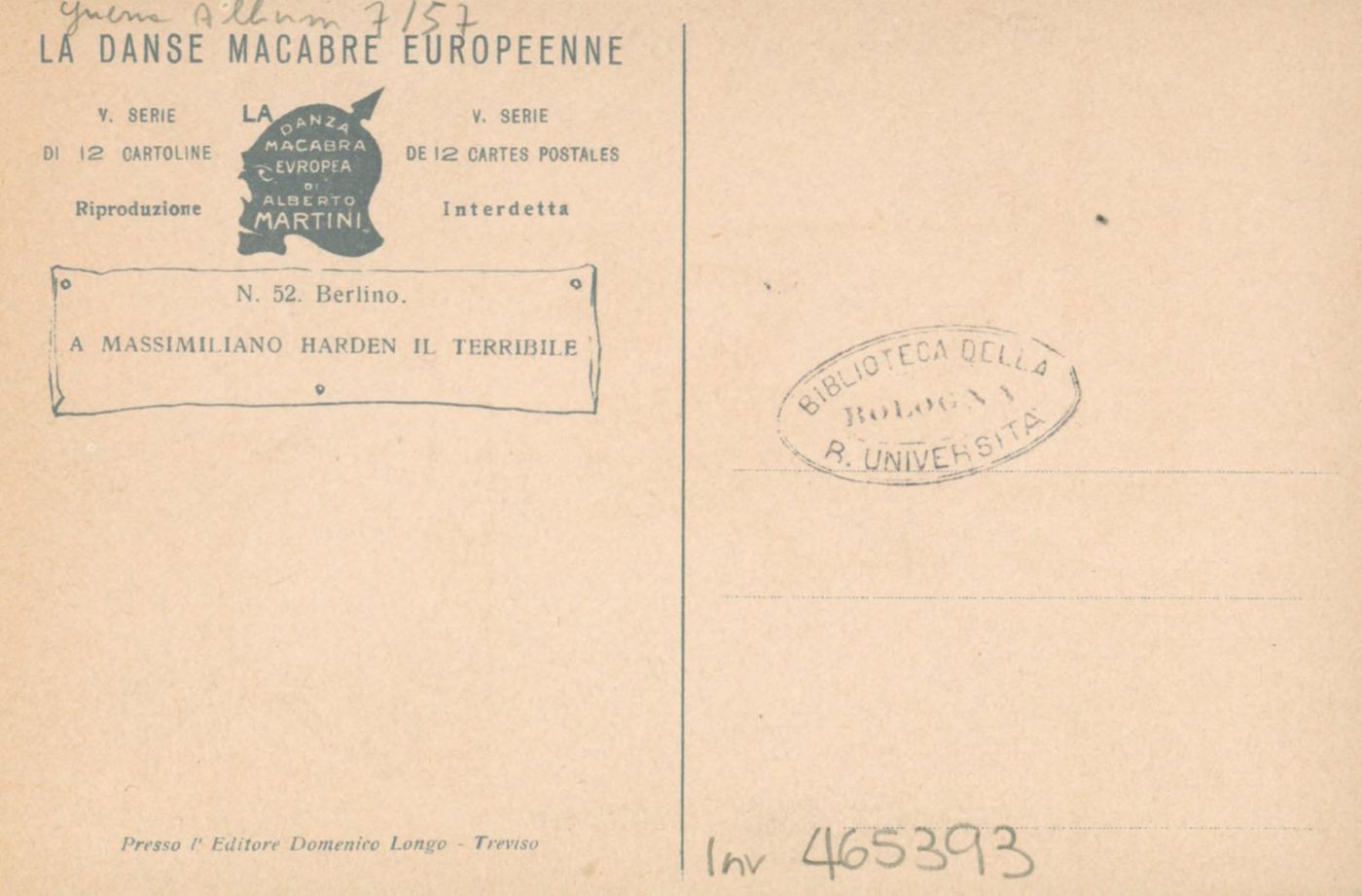 Note: Titolo in calce all'illustrazione in italiano e in francese. - Data sull'illustrazione. - Sul verso didascalia: A Massimiliano Harden il terribile. - Sull'illustrazione la città invasa dai morti