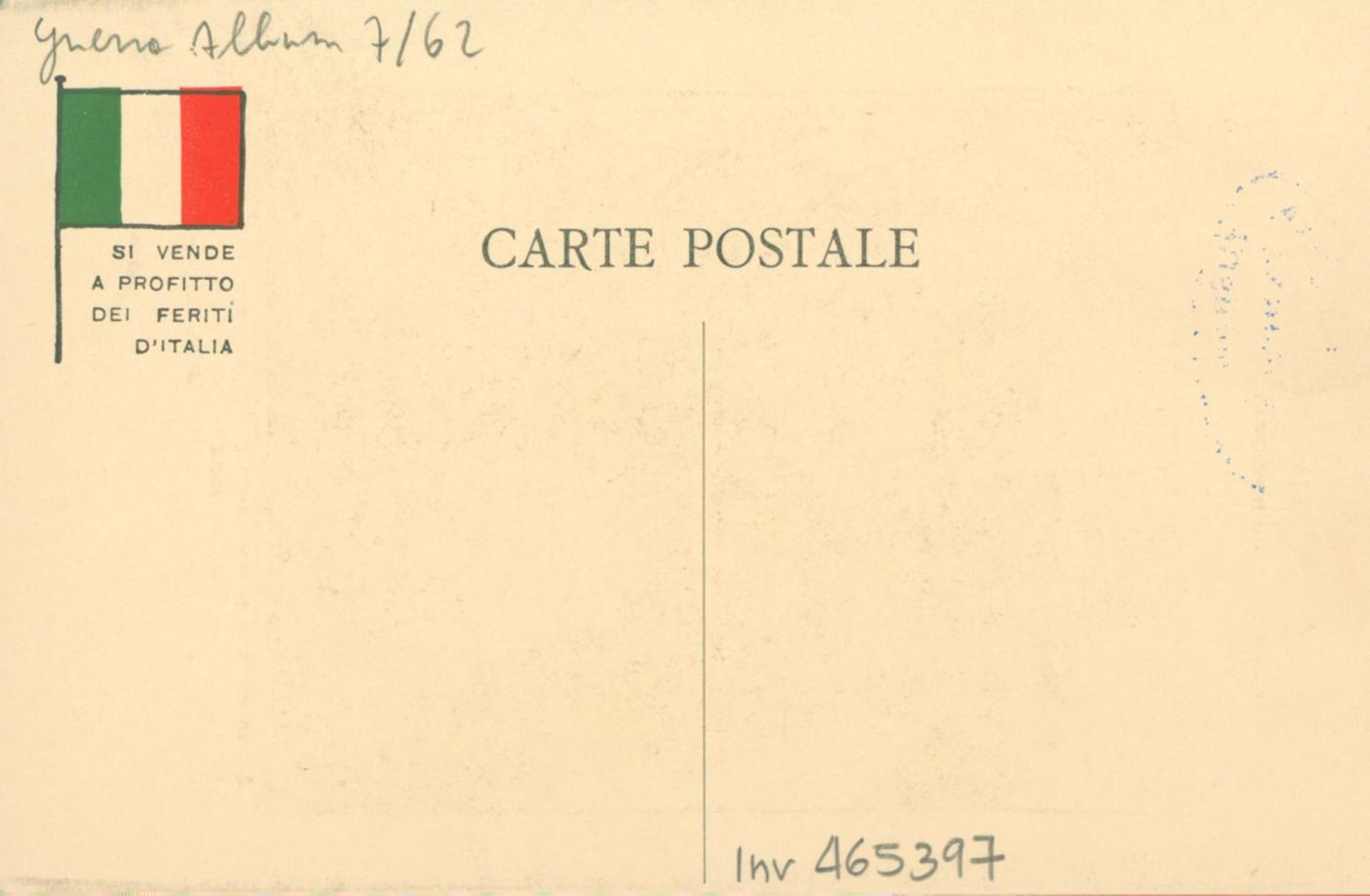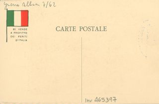 Note: In calce all'illustrazione didascalia in italiano e in francese: È una guerra di conquista! Eccomi: non posse [!] fare altrimenti. - Nome dell'autore da firma sull'illustrazione. - Nell'illustrazione Karl Liebknecht richiama Guglielmo 2. di Germania. - Sul verso, accanto a un tricolore stilizzato: si vende a profitto dei feriti d'Italia