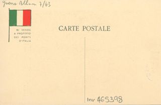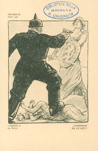Note: Titolo in testa all'illustrazione; in calce didascalia in italiano e in francese: L'onore o la vita!. - Nome dell'autore da firma sull'illustrazione. - Nell'illustrazione un soldato tedesco punta la pistola alla Francia mentre calpesta il Lussemburgo. - Sul verso, accanto a un tricolore stilizzato: si vende a profitto dei feriti d'Italia
