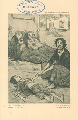 Note: Titolo in testa all'illustrazione; in calce didascalia in italiano e in francese: La kultur è passata di qui. - Nome dell'autore da firma sull'illustrazione. - Nell'illustrazione civili straziati dalle ferite. - Sul verso, accanto a un tricolore stilizzato: si vende a profitto dei feriti d'Italia