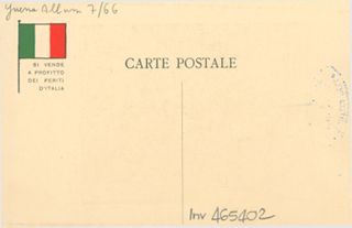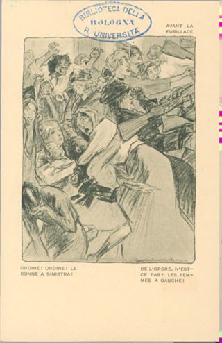 Note: Titolo in testa all'illustrazione; in calce didascalia in italiano e in francese: Ordine! Ordine! Le donne a sinistra!. - Nome dell'autore da firma sull'illustrazione. - Data riferita ai massacri in Belgio, a cui l'illustrazione fa probabilmente riferimento. - Nell'illustrazione donne ammassate spinte all'indietro da calci di fucile. - Sul verso, accanto a un tricolore stilizzato: si vende a profitto dei feriti d'Italia