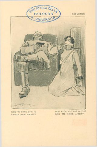 Note: Titolo in testa all'illustrazione; in calce didascalia in italiano e in francese: Non ti pare che io sappia farmi amare?. - Nome dell'autore da firma sull'illustrazione. - Data attribuita dal confronto con le altre cartoline della serie. - Nell'illustrazione soldato tedesco punta una pistola a una donna legata e imbavagliata. - Sul verso, accanto a un tricolore stilizzato: si vende a profitto dei feriti d'Italia