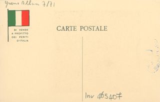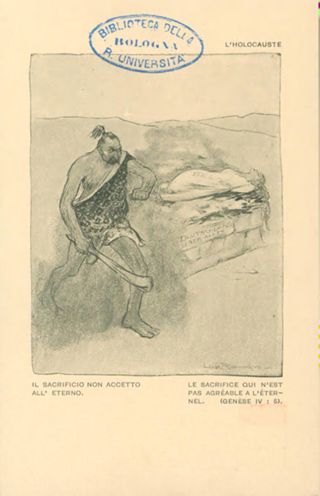Note: Titolo in testa all'illustrazione; in calce didascalia in italiano e in francese: Il sacrificio non accetto all'eterno . - Nome dell'autore da firma sull'illustrazione. - Data dell'invasione tedesca del Belgio, a cui l'illustrazione fa riferimento. - Nell'illustrazione Belgia uccisa da un uomo primitivo con la clava (la Germania). - Sul verso, accanto a un tricolore stilizzato: si vende a profitto dei feriti d'Italia