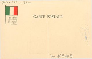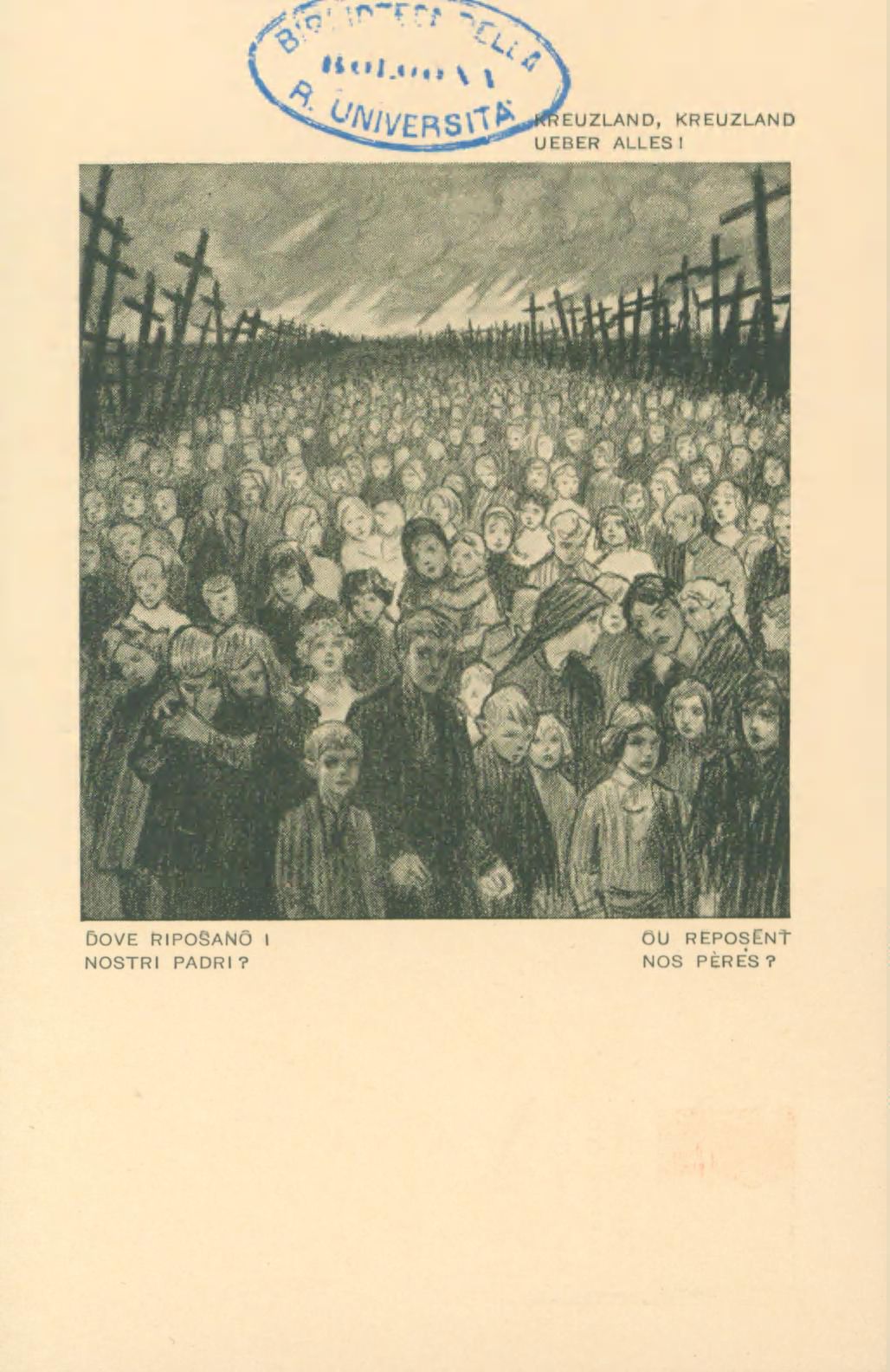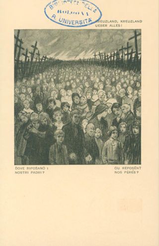 Note: Titolo in testa all'illustrazione; in calce didascalia in italiano e in francese: Dove riposano i nostri padri?. - Nome dell'autore da firma sull'illustrazione. - Data attribuita dal confronto con le altre cartoline della serie. - Nell'illustrazione massa di bambini orfani circondata da croci. - Sul verso, accanto a un tricolore stilizzato: si vende a profitto dei feriti d'Italia