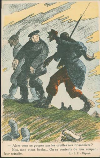 Alors vous ne goupez pas les oreilles aux brisonniers? - Non, mon vieux boche... On se contente de leur couper... leur retraite