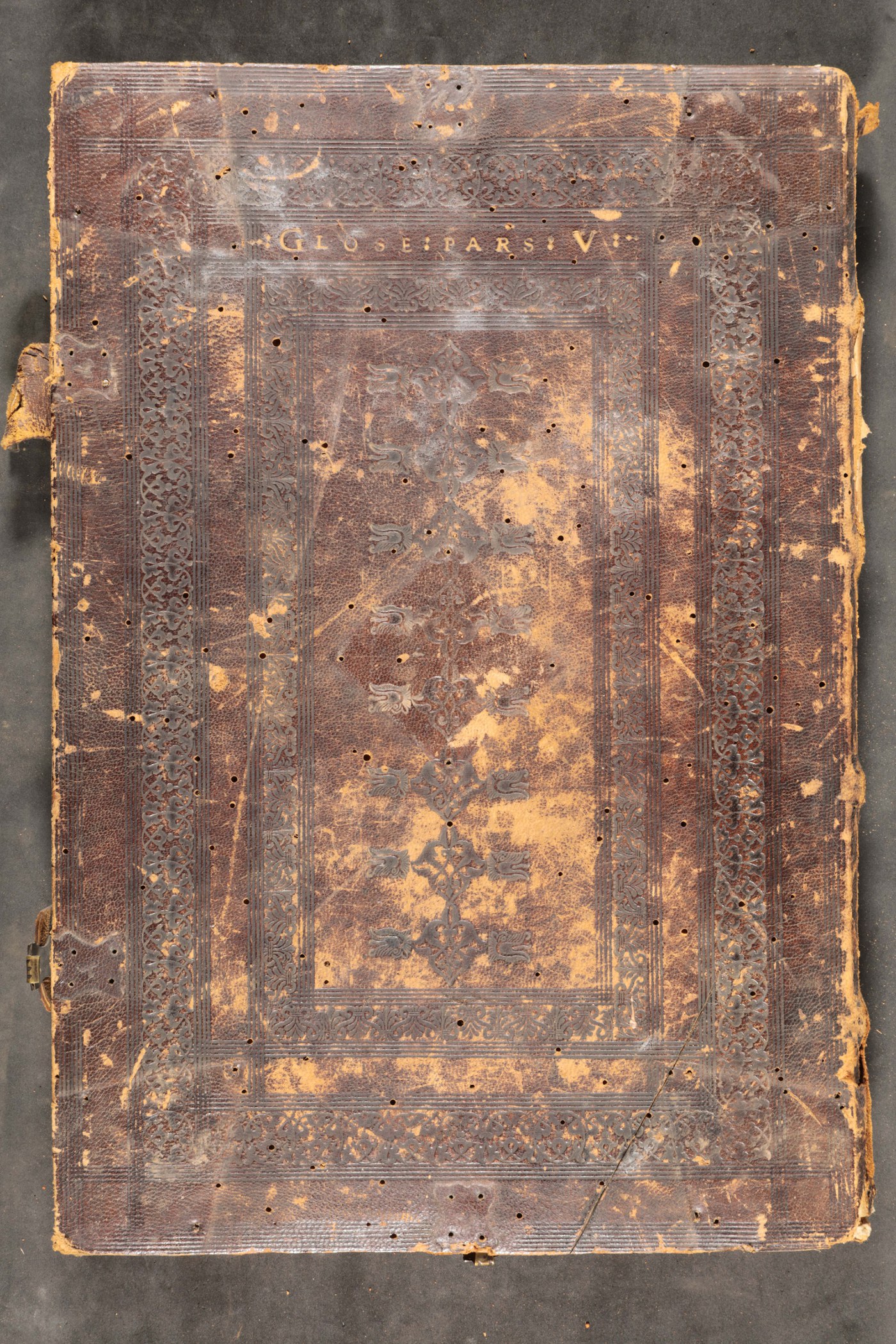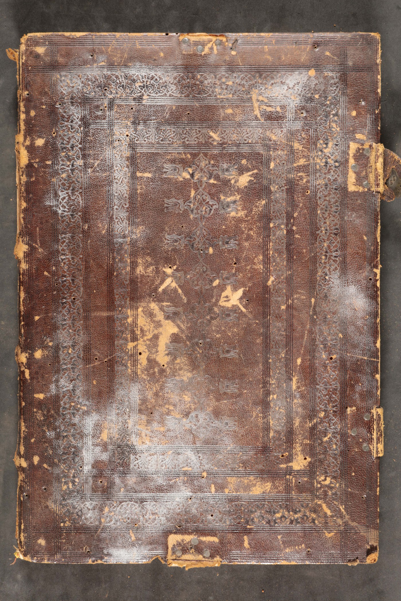 Cuoio di capra marrone su assi lignee smussate ai contropiatti in corrispondenza dei tagli, decorato a secco e in oro. Tracce di quattro cantonali lanceolati e umbone su base quadrangolare. Filetti concentrici. Coppia di cornici caratterizzate da arabeschi e palmette alternativamente rovesciate; serie di fregi mamelucchi entro coppie di testa lupine disposti verticalmente nello specchio. Tracce di quattro fermagli e di bindelle in cuoio marrone provviste di puntale. Scompartimenti del dorso provvisti di filetti incrociati, tranne nel secondo in cui campeggiano il titolo dell’opera e la partizione. Capitello di testa assente; anima in pelle allumata avvolta da fili in canapa e in seta rosa e verde (residui) quello al piede. Cucitura su quattro nervi rilevati in pelle allumata fendue. Indorsatura realizzata tramite alette orizzontali cartacee. Labbri muti. Rimbocchi discretamente rifilati. Carte di guardia bianche. Tagli rustici. Stato di conservazione: mediocre. Gore grigie e spellature al materiale di copertura. Cerniere particolarmente indebolite.