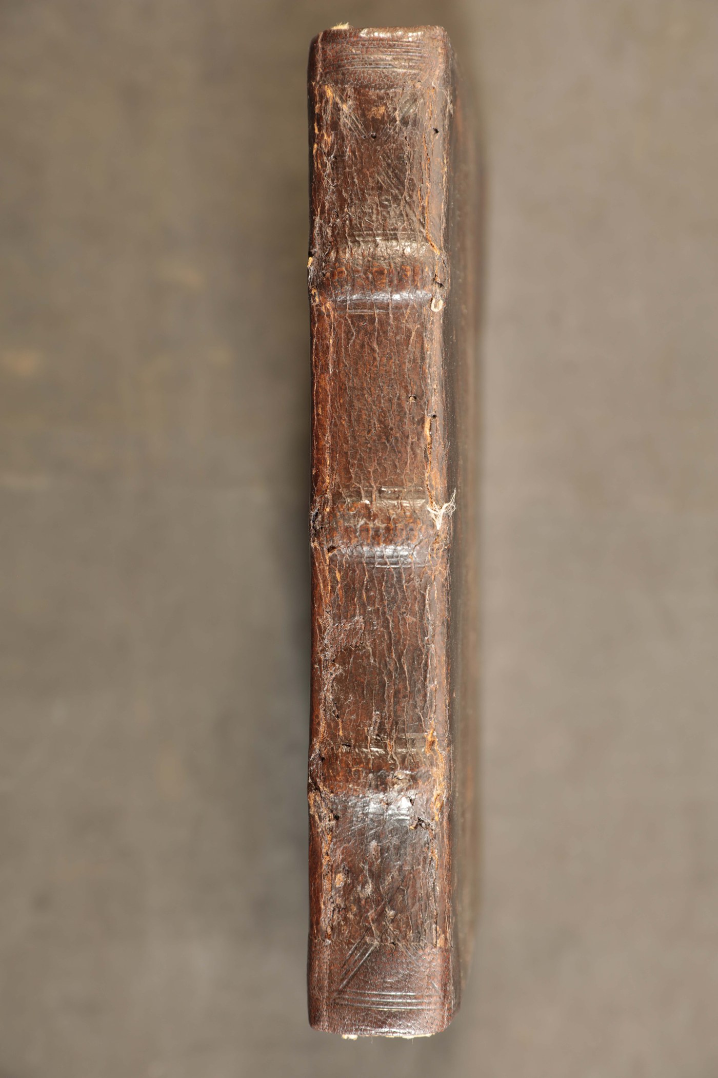 Cuoio di capra bruno su quadranti in cartone, decorato a secco e in oro. Tracce di quattro coppie di lacci. Filetti concentrici in parte collegati agli angoli. Vignetta centrale costituita da fogliami bucati entro sei rosette dai margini bilobati, internamente provvista del titolo dell’opera al piatto anteriore e della destinataria a quello posteriore Cornice caratterizzata da arabeschi. Tracce di quattro lacci. Capitelli, indorsatura, rimbocchi e carte di guardia (parzialmente) rinnovati. Cucitura su tre nervi rilevati. Labbri muti. Tagli dorati incisi. Stato di conservazione: mediocre - discreto. Spellature al materiale di copertura originale, parzialmente scomparso. Volume restaurato.