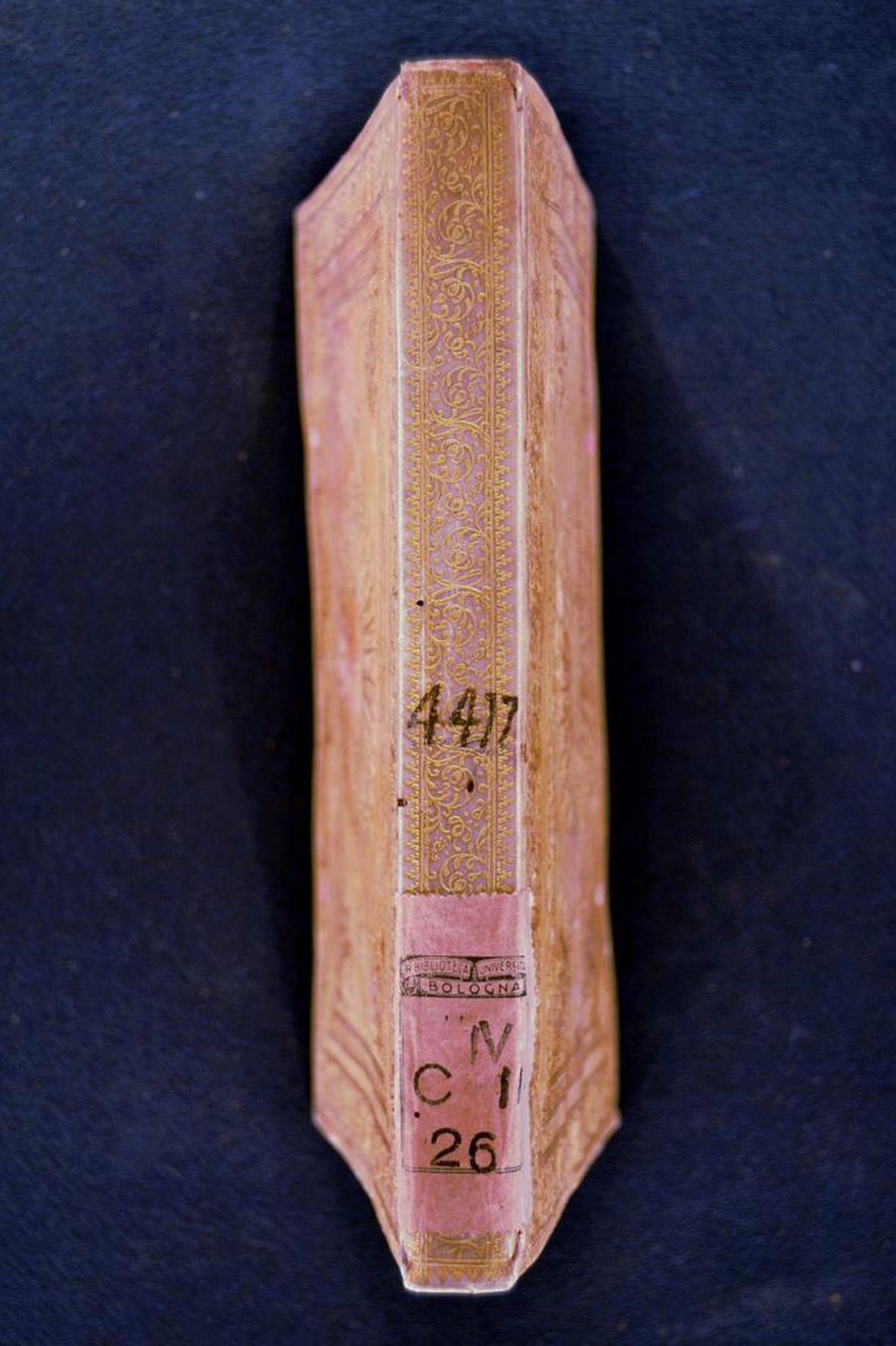 I fregi, la nota, l’argomento e le note tipografiche propongono di assegnare la legatura al secondo quarto del XVII secolo, verosimilmente eseguita a Bologna. In evidenza i lacci in seta rossa e bianca, l’indorsatura realizzata tramite aletta cartacea in foggia di trapezio di transalpina memoria, i rimbocchi accuratamente rifilati, i tagli dorati e il frontespizio illustrato.