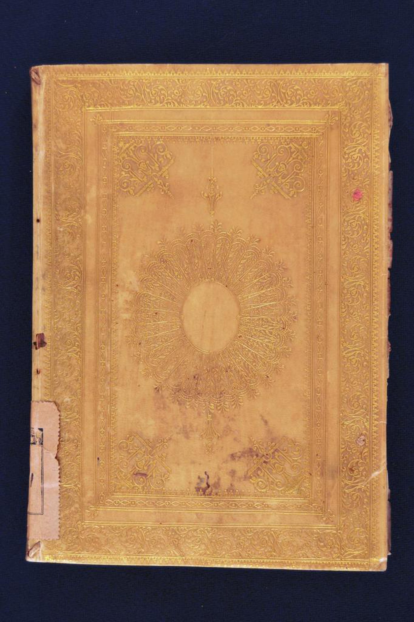 Pergamena rigida decorata in oro. Cornici concentriche caratterizzate da monticelli, volute fogliate (motivi ripresi lungo il rettangolo collocato al dorso liscio), catenelle. Testina classica negli angoli interni dello specchio; rosone centrale (80x75 mm) costituito da lancette. Tracce di due coppie di lacci in seta rossa e bianca. Capitelli costituti da anima in pelle allumata passante avvolta da fili in seta bianca e rosa. Cucitura su tre nervi. Indorsatura realizzata tramite aletta cartacea sotto forma di trapezio. Rimbocchi accuratamente rifilati. Carte di guardia bianche. Tagli dorati. Stato di conservazione: mediocre - discreto. Piatto anteriore in fase di distacco dal blocco. Marginali bruniture al piatto posteriore.