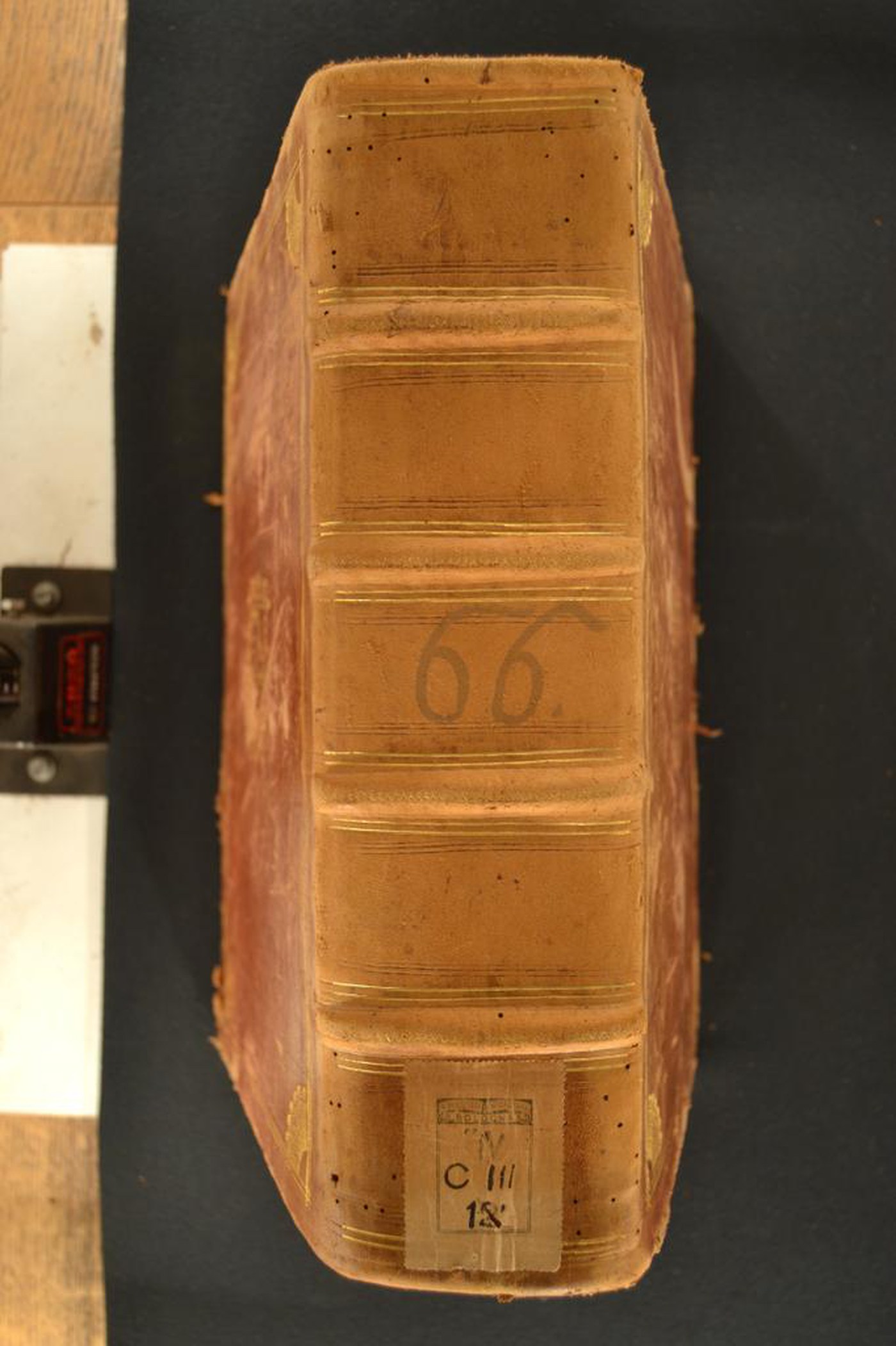 Cuoio di bazzana marrone su quadranti in cartone decorato a secco e in oro. Filetti concentrici. Cornici a due filetti dorati, Mezzo ventaglio negli angoli interni dello specchio. Armi (55x40 mm) riferibili alla città di Bologna. Tracce di due coppie di lacci. Capitelli muniti di anima circolare avvolta da fili in canapa e in seta rosa. Cucitura su quattro nervi rilevati. Indorsatura realizzata tramite alette orizzontali cartacee. Rimbocchi rifilati senza particolare cura. Carte di guardia bianche. Tagli spruzzati di rosso. Stato di conservazione: mediocre. Spellature al materiale di copertura. Angoli ricurvi.