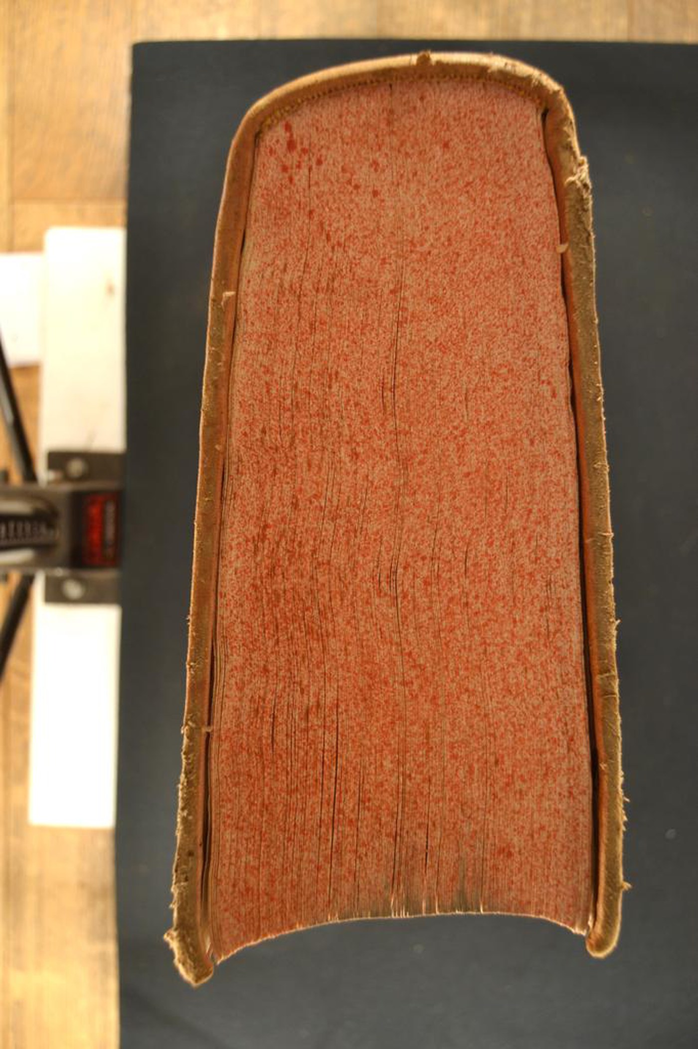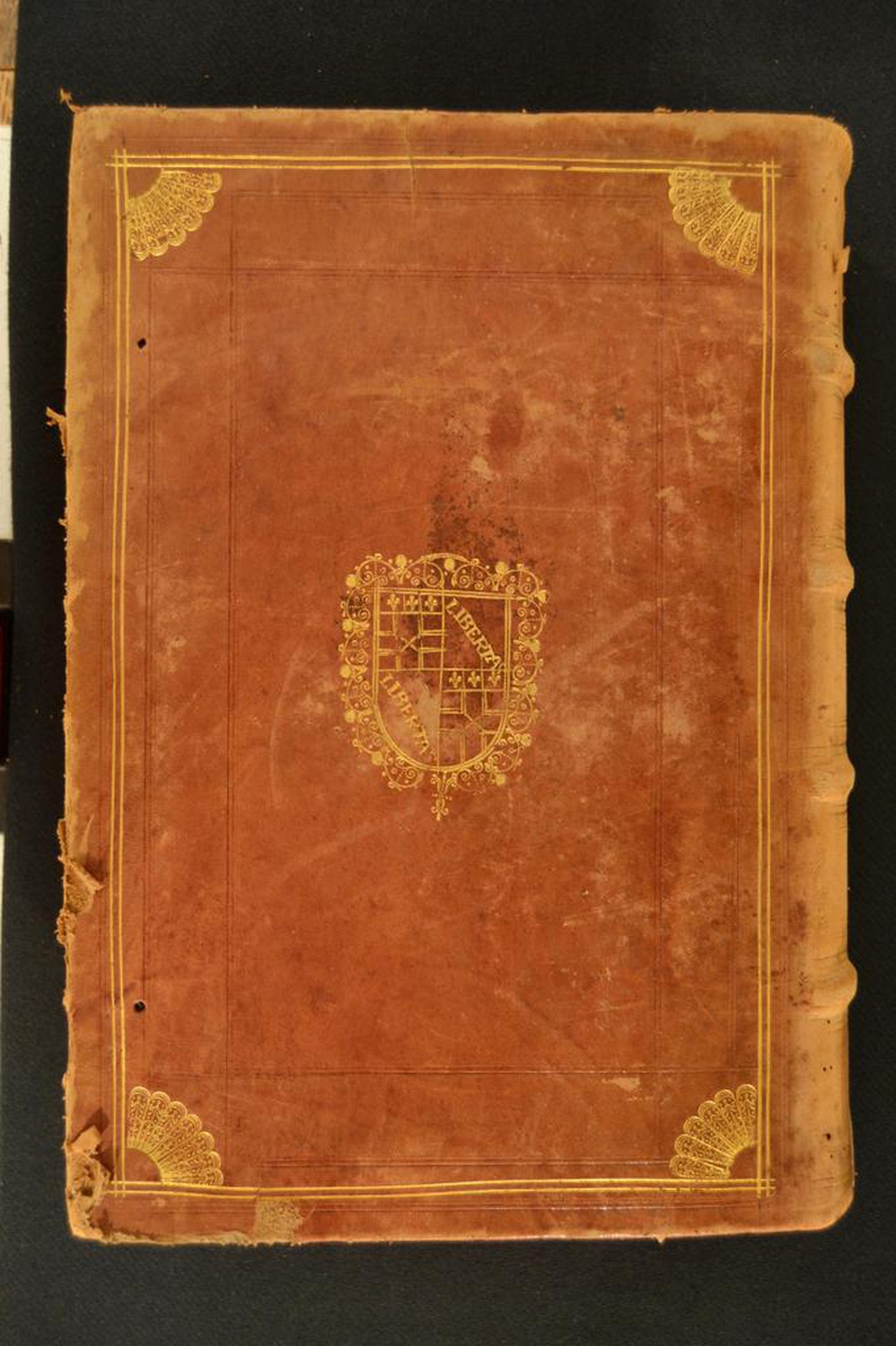L’impianto ornamentale, le armi, l’iscrizione e le note tipografiche inducono ad assegnare la legatura al 1653, eseguita a Bologna. In evidenza i tagli spruzzati e la tavola calcografica.