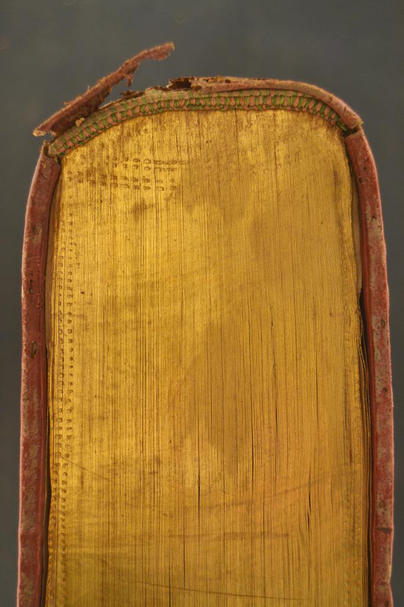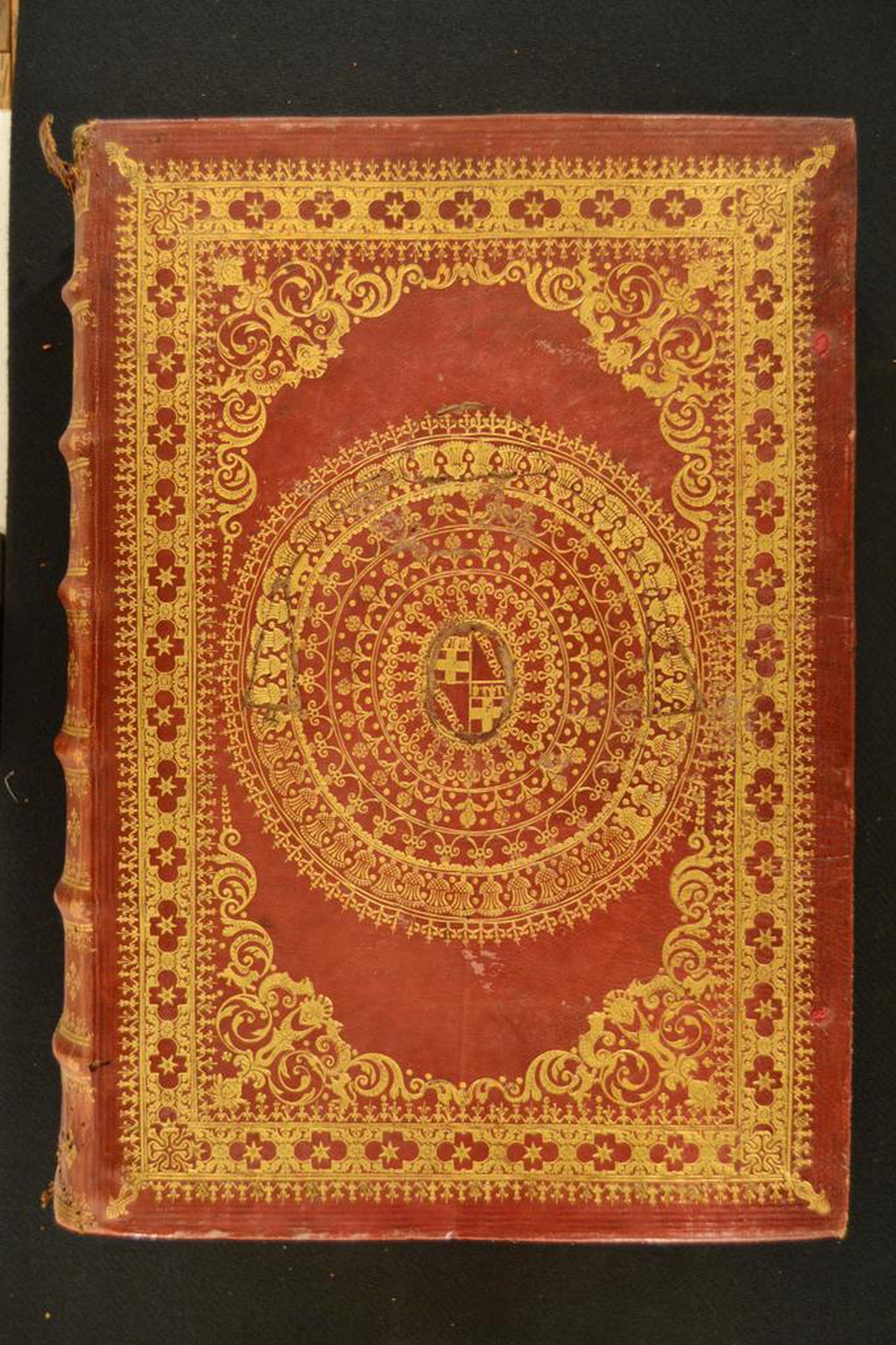Cuoio di capra rosso su quadranti in cartone decorato a secco e in oro. Coppia di cornici concentriche caratterizzate da ornamento a pizzo e stelle a sei punte entro cartella polilobata alternata a due ovali entro due paia di fogliami caudati. Margini interni dello specchio provvisti di motivi a pizzo, volute fogliate, corolle oblunghe, testine classiche, grifoni dal fiore sul petto. Ampio rosone centrale costituito da motivi fitomorfi e stilizzati a delimitare le armi della città di Bologna. Il cognome dell’autore e il titolo dell’opera nel primo scompartimento del dorso arrotondato; tre motivi costituiti da quattro gigli addossati in quelli residui. Capitelli muniti di due anime avvolte da fili in lino rosa e azzurro. Cucitura su sei nervi rilevati delimitati da due filetti orizzontali affiancati dal decoro a pizzo in testa e al piede. Indorsatura realizzata tramite alette orizzontali cartacee. Labbri muti. Rimbocchi rifilati senza particolare cura. Carte di guardia bianche. Tagli dorati incisi. Stato di conservazione: discreto. Materiale di copertura in fase di distacco nella porzione superiore del dorso.