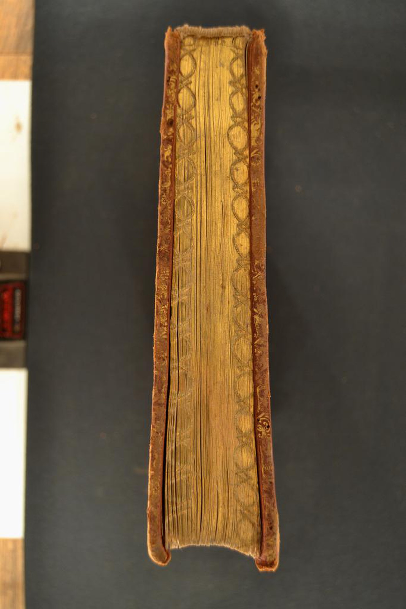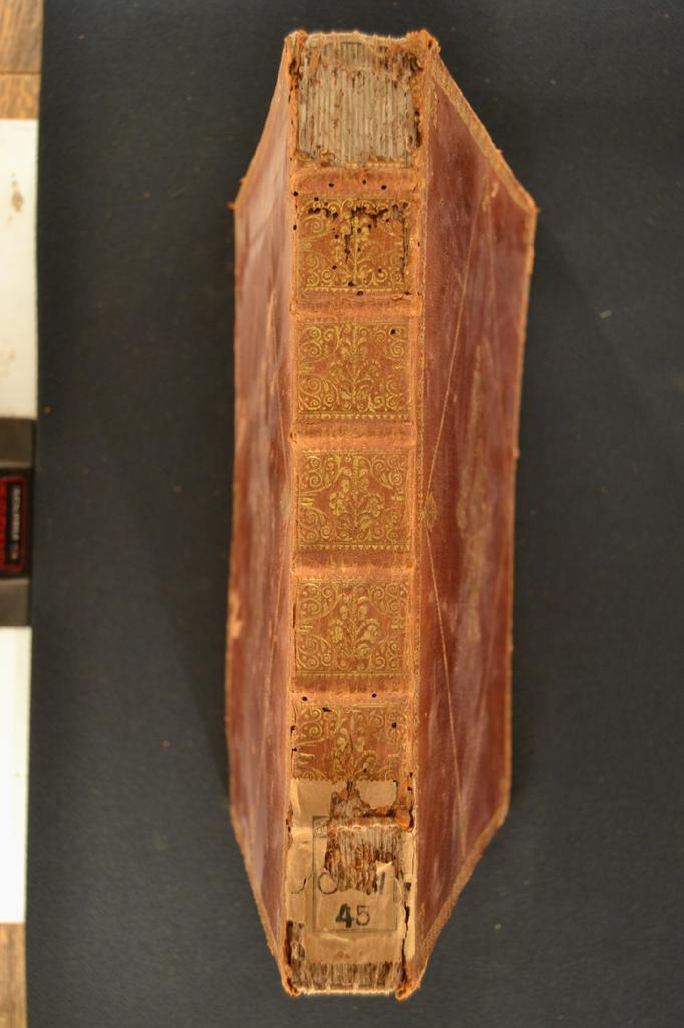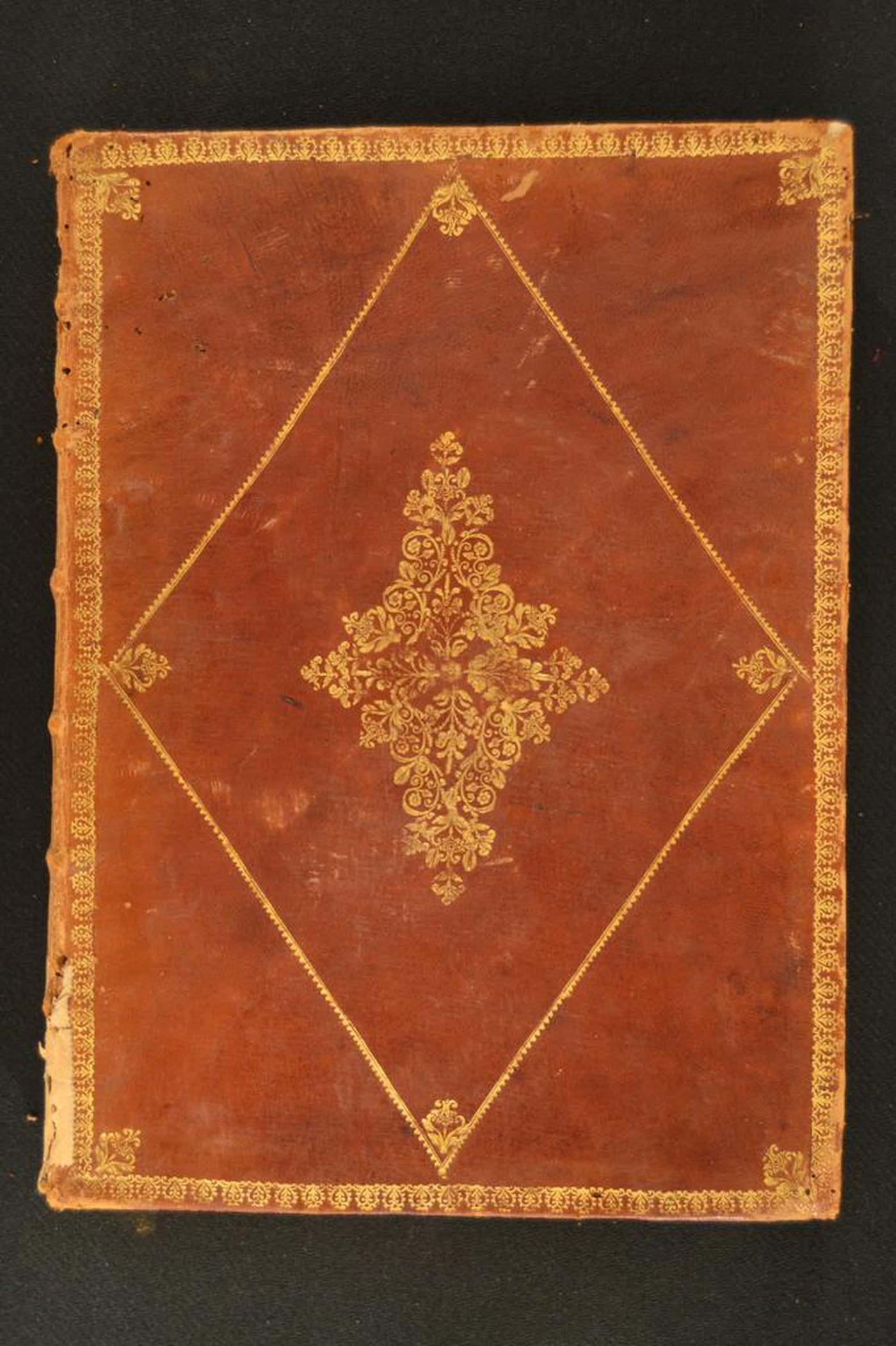 Cuoio di bazzana marrone su quadranti in cartone decorato in oro. Cornice caratterizzata da motivi cuoriformi. Motivo fitomorfo negli angoli interni dello specchio e dell’ampia losanga, parzialmente ripresi e affiancati da grottesche nella cartella centrale. Scompartimenti del dorso riquadrati. Volute negli angoli interni e motivo fitomorfo centrale. Capitelli muniti di anima circolare avvolta da fili in canapa. Cucitura su sei nervi rilevati. Indorsatura realizzata tramite aletta orizzontale cartacea. Labbri ornati a pizzo. Rimbocchi rifilati senza particolare cura. Contropiatti rivestiti da foglio in carta marmorizzata policroma pettinata. Carte di guardia bianche. Tagli dorati brillanti incisi. Stato di conservazione: mediocre. Bruniture e spellature al materiale di copertura dalla tonalità scolorita lungo il dorso, ivi parzialmente scomparso in testa e al piede. Piatto anteriore disassato rispetto al blocco. Supporto posteriore ricurvo al piede.