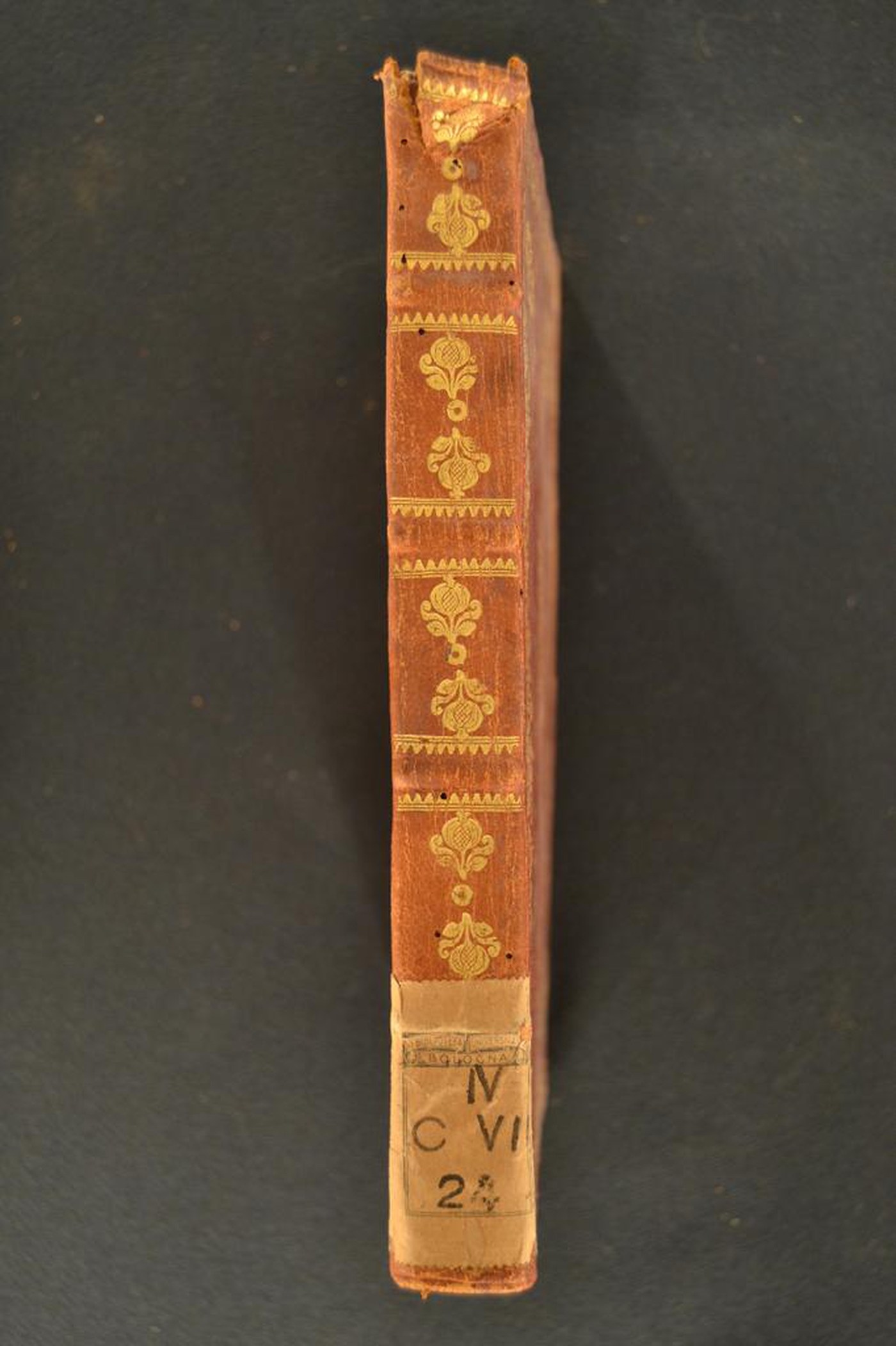 Gli inediti fregi, le opere dell’autore frequentemente impresse a Cremona e le note tipografiche propongono di assegnare la legatura alla metà del XVIII secolo, verosimilmente eseguita in Lombardia. In evidenza i contropiatti rivestiti da foglio in carta spugnata e i tagli dorati brillanti.