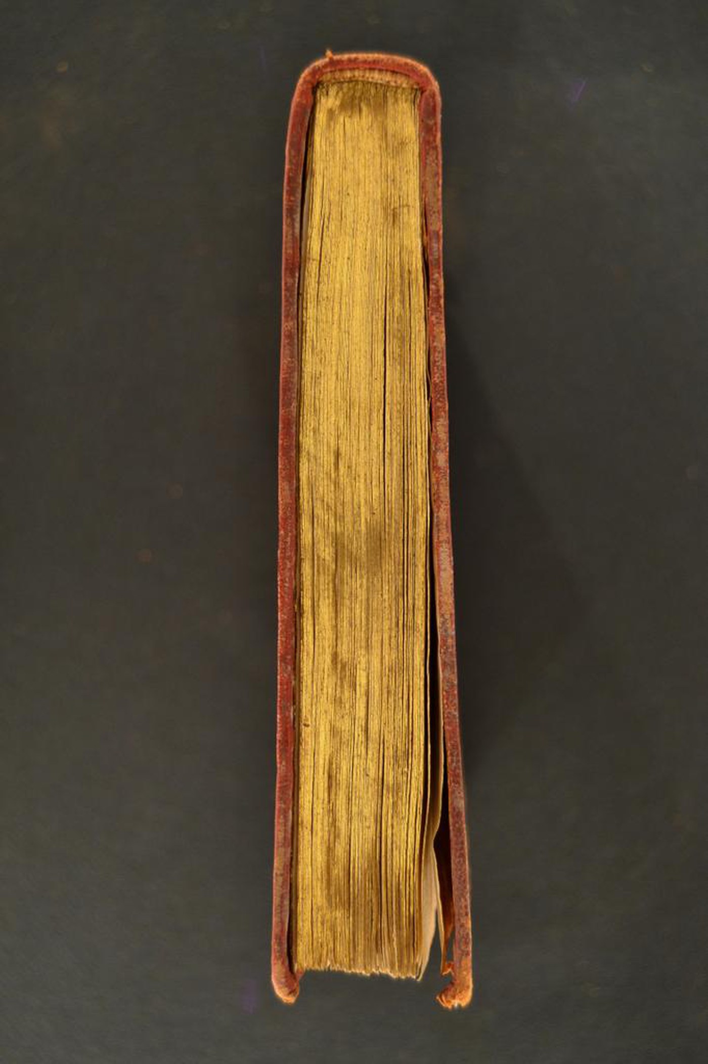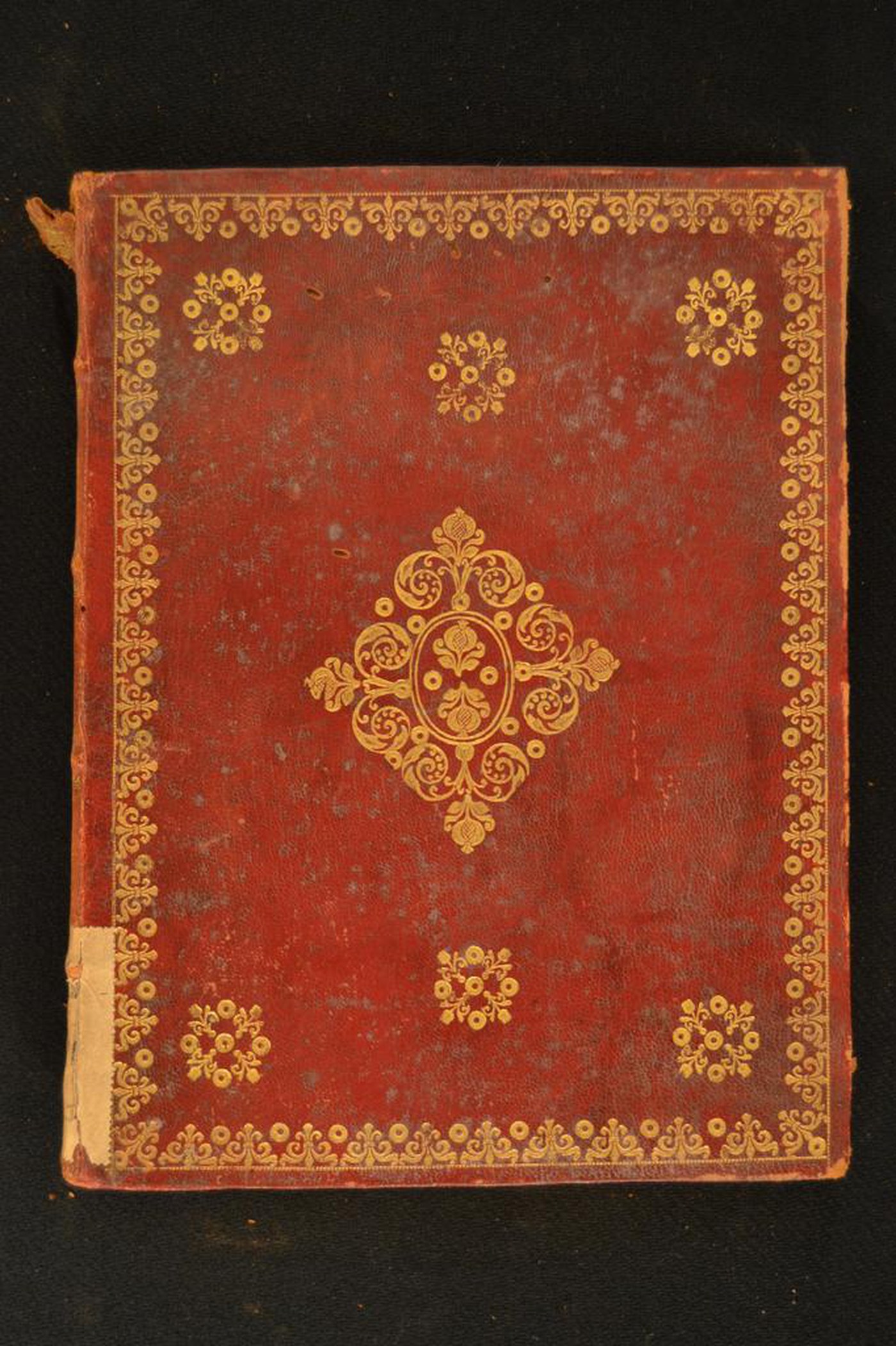 Cuoio di capra rosso su quadranti in cartone decorato in oro. Margine interno dello specchio a filetto filigranato caratterizzato da coppie di volute sormontate da giglio alternate a cerchielli forati, questi ultimi ripresi in sei mazzi con corolle stilizzate; un paio di melograni addossati (ripresi negli scompartimenti del dorso) e cerchielli forati nell’ovale centrale affiancato da volute fogliate. Capitelli muniti di anima circolare avvolta da fili in canapa. Cucitura su quattro nervi rilevati. Indorsatura e rimbocchi non osservabili. Labbri muti. Carte di guardia spugnate policrome e bianche. Tagli dorati brillanti incisi. Stato di conservazione: mediocre - discreto. Diffuse gore grigie al materiale di copertura dalla tonalità scolorita lungo il dorso, ivi in fase di distacco nella porzione superiore.