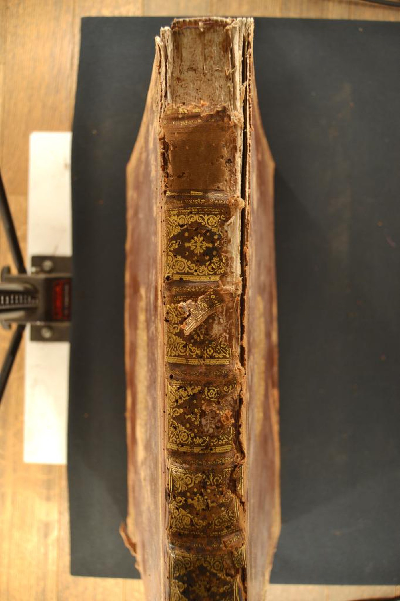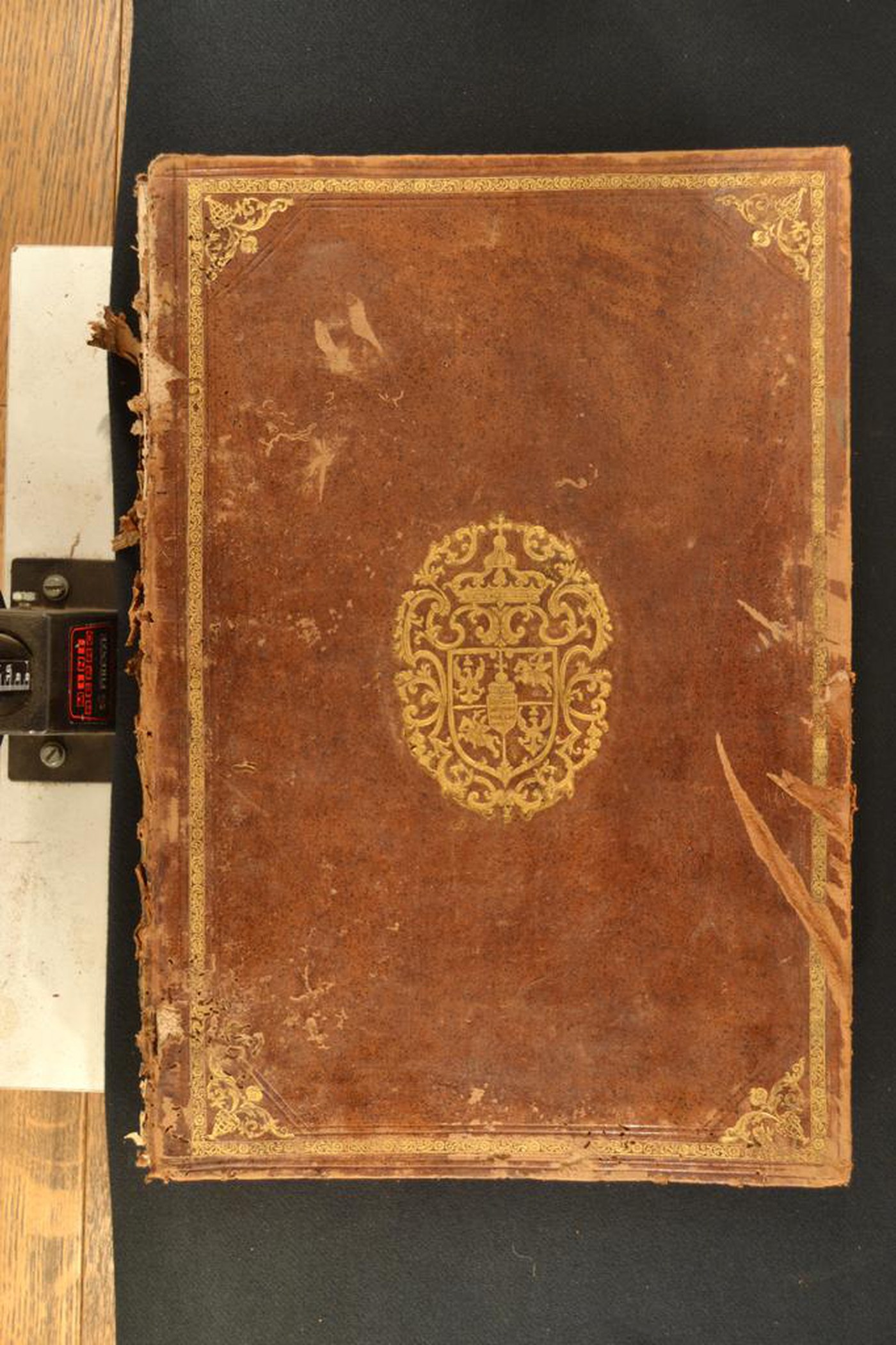 Cuoio di bazzana marmorizzato marrone su quadranti in cartone decorato a secco e in oro. Cornice fiorita e fogliata. Motivi fitomorfi lungo il margine interno dello specchio. Armi (135x95 mm) riferibili a Stanislao II Augusto Poniatiwski (1732-1798). Volute fiorite negli scompartimenti interni del dorso Capitelli in canapa in fase di distacco. Cucitura su otto nervi. Indorsatura realizzata tramite alette orizzontali cartacee. Rimbocchi discretamente rifilati. Carte di guardia spugnate policrome e bianche. Tagli rossi. Stato di conservazione: mediocre. Spellature al materiale di copertura, parzialmente scomparso in testa al dorso. Piatto anteriore in fase di distacco. Supporti in vista. Angoli sbrecciati.