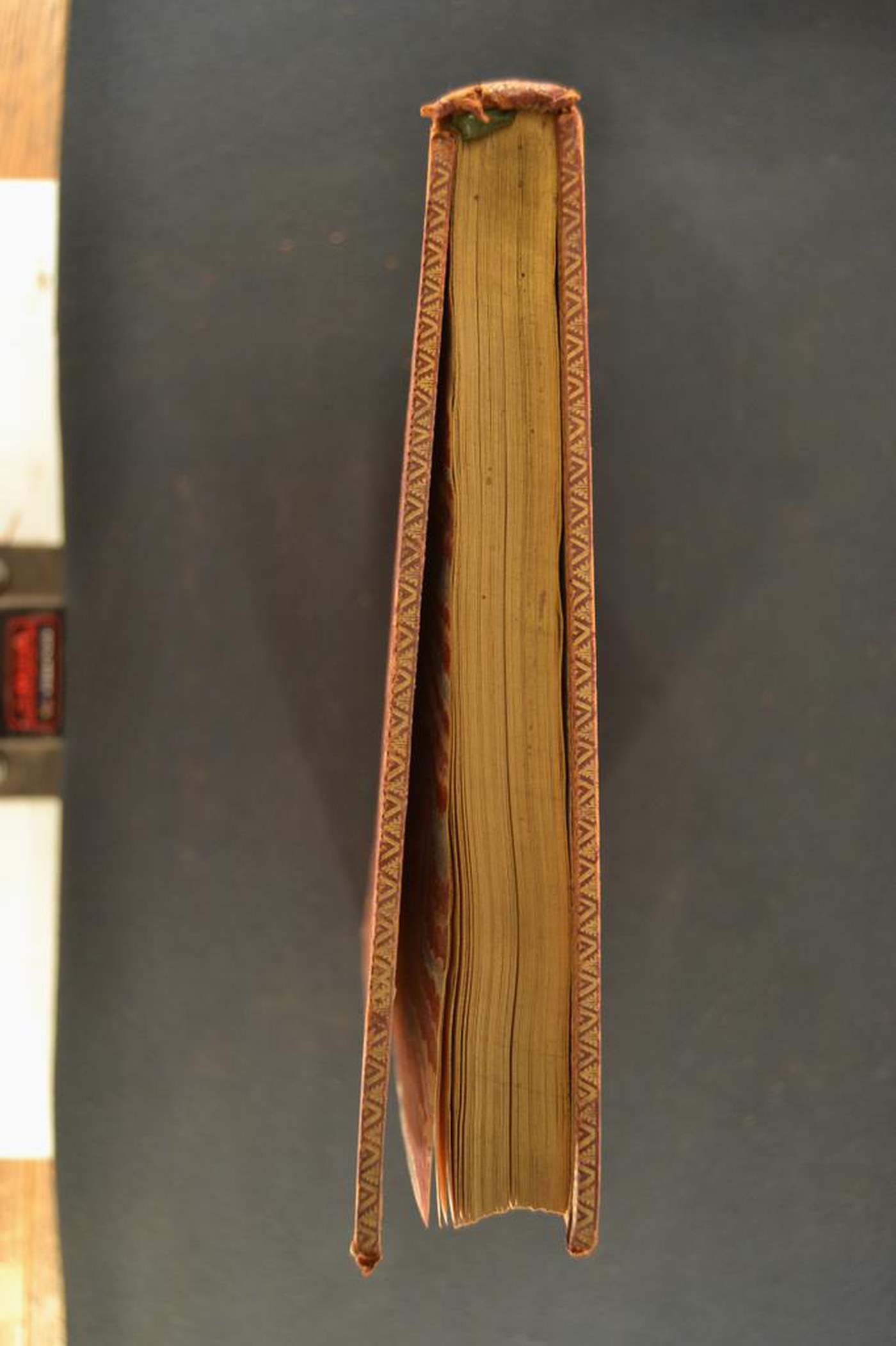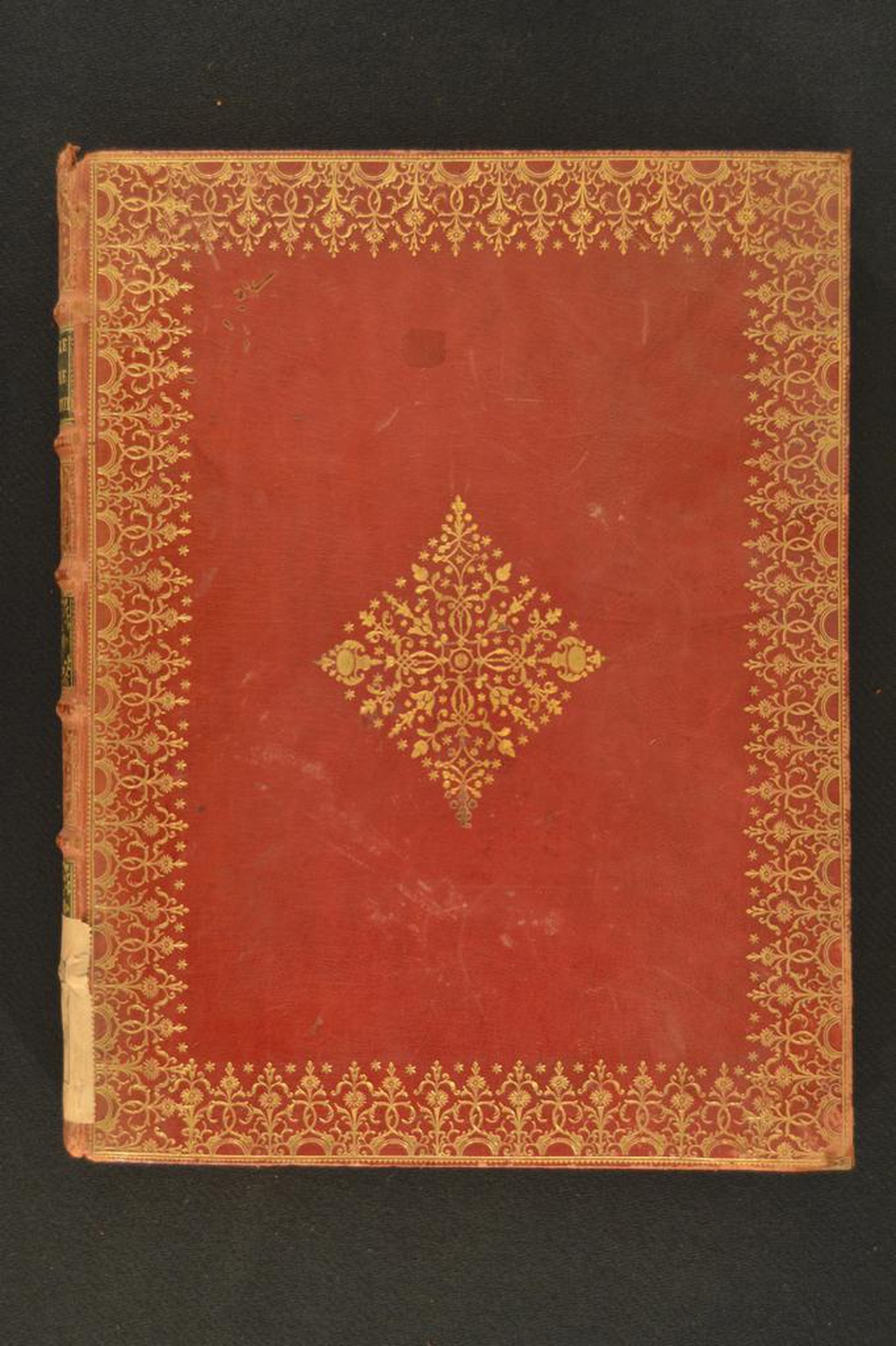Cuoio di capra rosso su quadranti in cartone decorato in oro e a mosaico. Cornice a filetto filigranato e continuo. Archi sormontati da fiorami. Cartella losangata centrale costituita da motivi fitomorfi. Scompartimenti del dorso riquadrati. Nel secondo, il cognome dell’autore e il titolo dell’opera entro il tassello; corolla stilizzata negli angoli interni e quattro fregi fitomorfi addossati centrali alternativamente entro sfondo in corame nero in quelli residui. Capitelli muniti di anima circolare avvolta da fili in canapa. Cucitura su sei nervi. Indorsatura realizzata tramite alette orizzontali cartacee. Labbri e margini dei contropiatti ornati a pizzo. Rimbocchi non osservabili. Carte di guardia marmorizzate policrome pettinate e bianche. Tagli dorati brillanti. Segnacolo in tessuto verde. Stato di conservazione: mediocre. Materiale di copertura strappato al piatto posteriore. Angoli di piede sbrecciati.