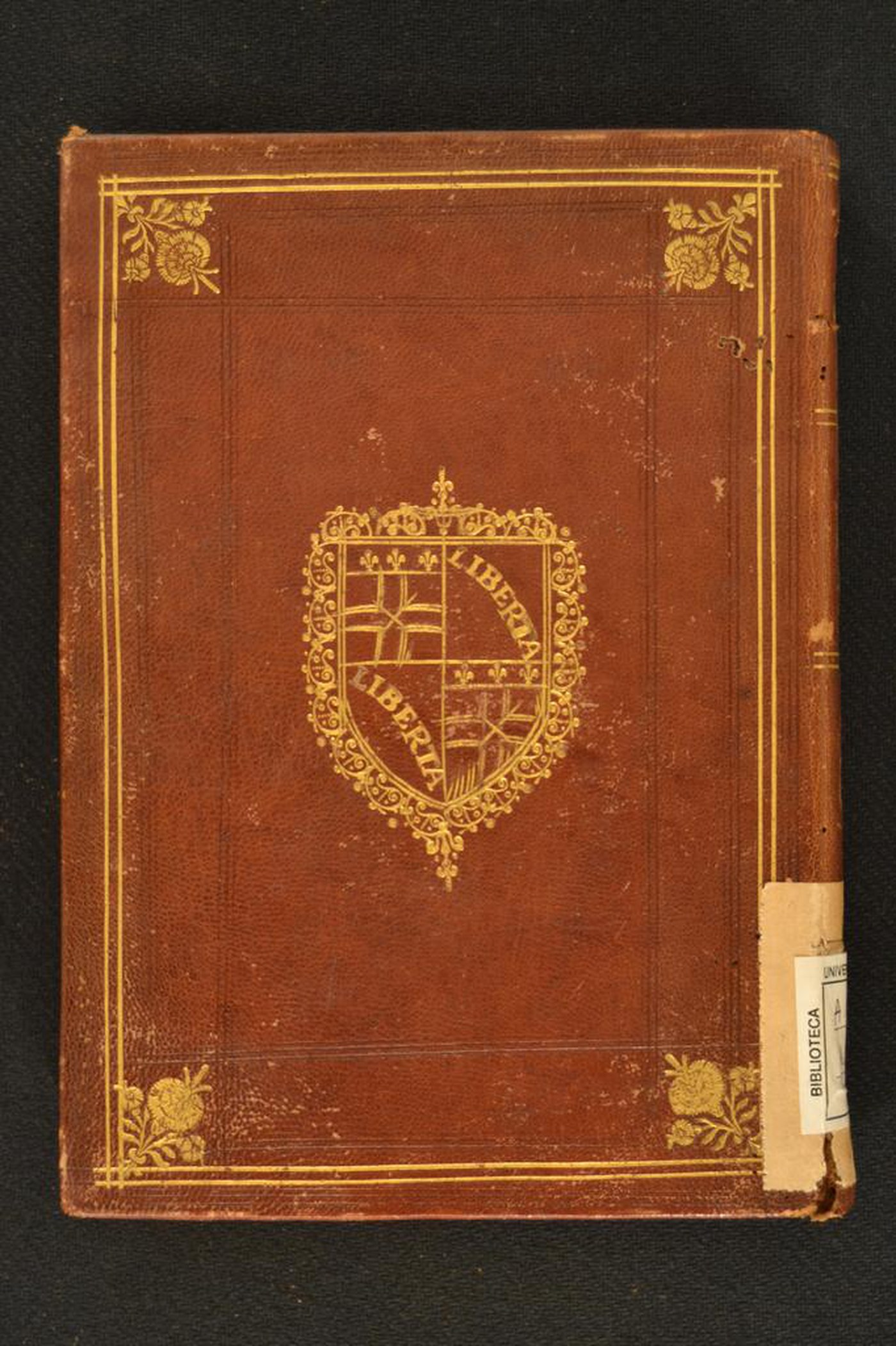 Cuoio di capra marrone su quadranti in cartone decorato a secco e in oro. Filetti concentrici. Cornice a due filetti. Garofano negli angoli interni dello specchio. Armi (55x45 mm) riferibili alla città di Bologna. Testina classica negli scompartimenti del dorso. Capitelli muniti di anima circolare avvolta da fili in canapa e in seta rosa e bianca. Cucitura tre su nervi. Indorsatura realizzata tramite aletta verticale cartacea. Rimbocchi rifilati senza particolare cura. Carte di guardia bianche. Tagli dorati. Stato di conservazione: mediocre. Spellature al materiale di copertura. Piatto anteriore in fase di distacco al piede.