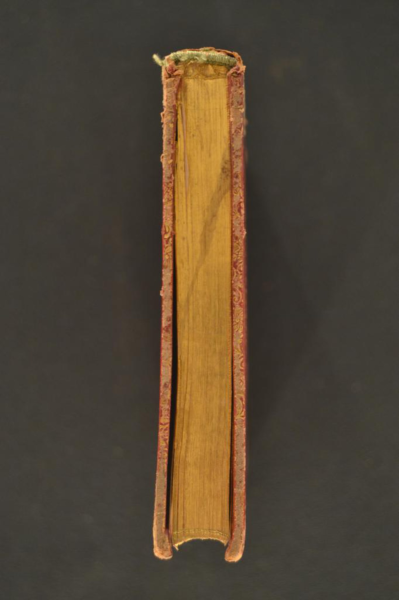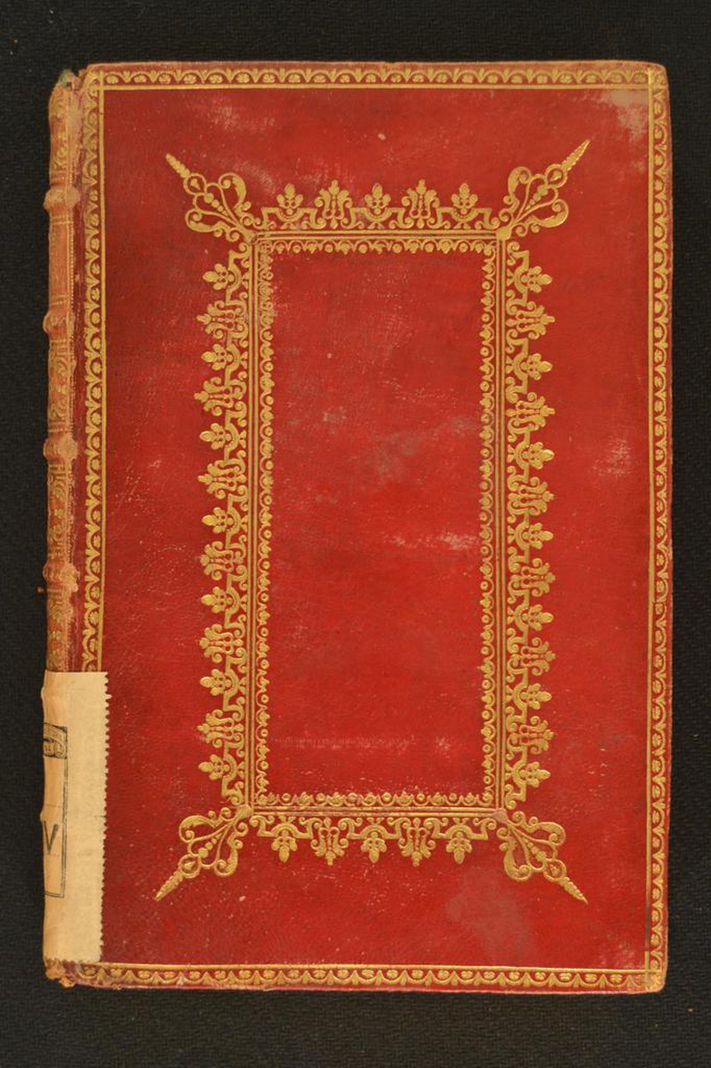Cuoio di bazzana rosso su quadranti in cartone decorato in oro. Coppia di cornici concentriche caratterizzate da minuti fogliami entro archi, corolle stilizzate alternate a ghiande entro nastri; motivo cuoriforme entro coppia di volute sormontati da perle degradanti. Scompartimenti del dorso riquadrati. Nel secondo, il titolo dell’opera; voluta caudata negli angoli interni e fregio fitomorfo entro sfondo quadrangolare centrale in quelli residui. Capitelli muniti di anima circolare avvolta da fili in seta turchese. Cucitura su sei nervi rilevati. Indorsatura e rimbocchi non osservabili. Labbri ornati con fogliami e fiorami. Carte di guardia marmorizzate policrome pettinate e bianche. Tagli dorati brillanti. Stato di conservazione: discreto. Bruniture e spellature al materiale di copertura, specie al piatto posteriore, dalla tonalità scolorita lungo il dorso. Angoli ricurvi.