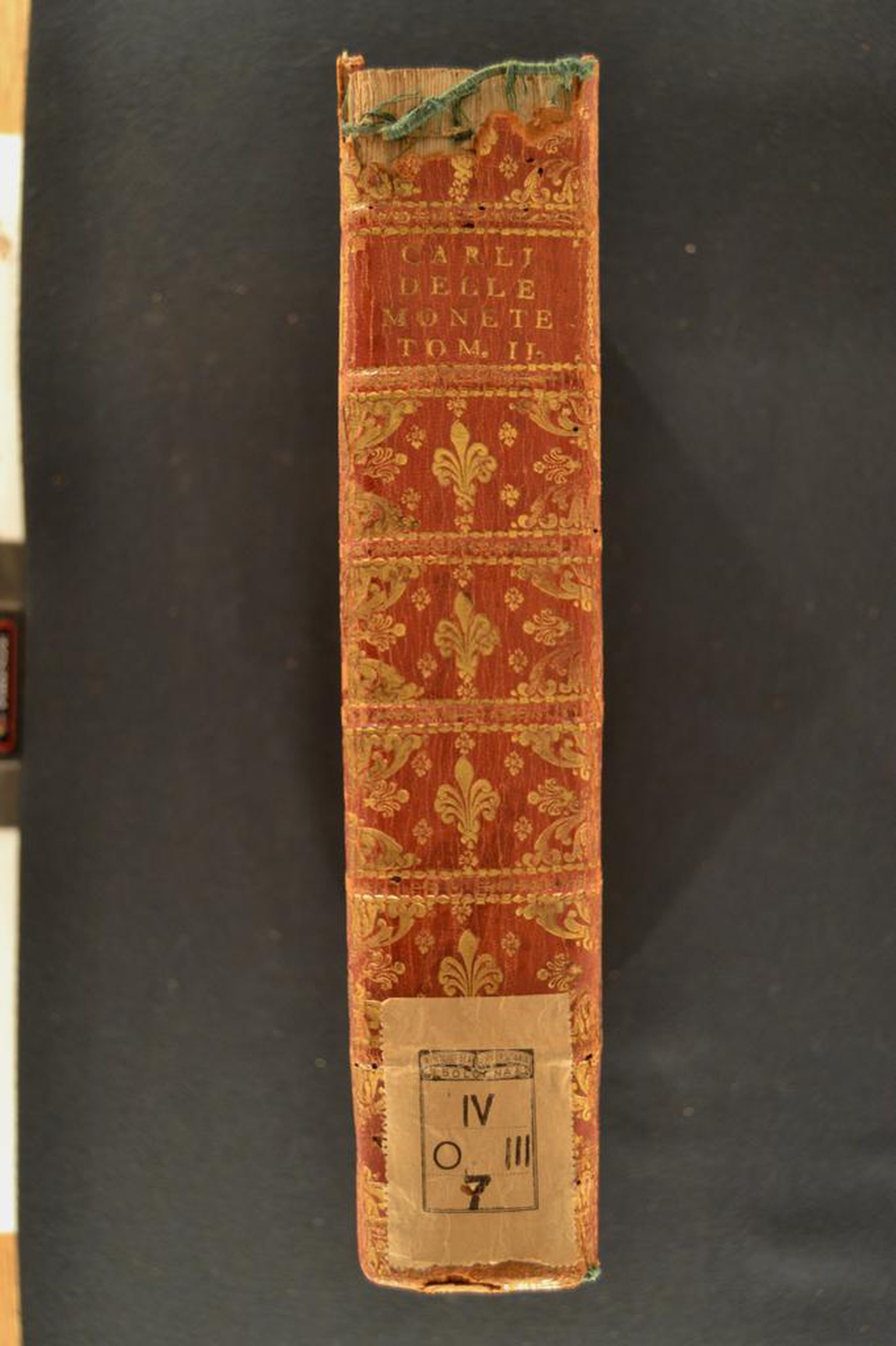Carli, Gian Rinaldo, Delle monete e dell'instituzione delle zecche d'Italia dell'antico, e presente sistema d'esse: e del loro intrinseco valore, e rapporto con la presente moneta. Dalla decadenza dell'impero sino al secolo 17. Per utile delle pubbliche, e delle private ragioni. Dissertazioni del conte don Gianrinaldo Carli-Rubbi ... [Tomo primo-terzo], In Mantova, 1754, 287x208x60 mm.