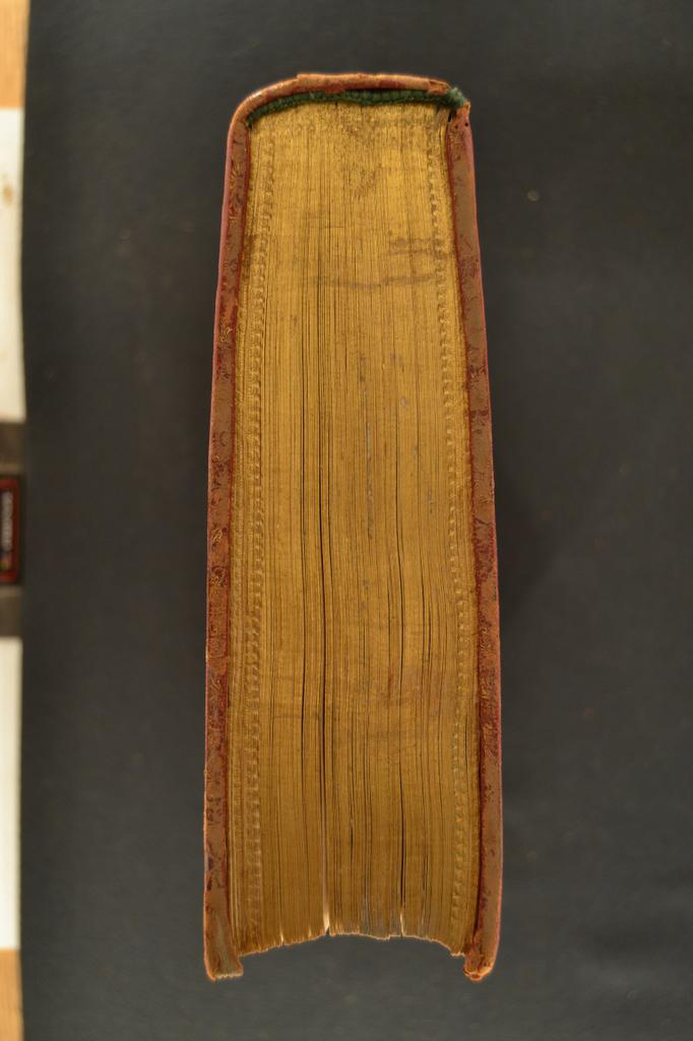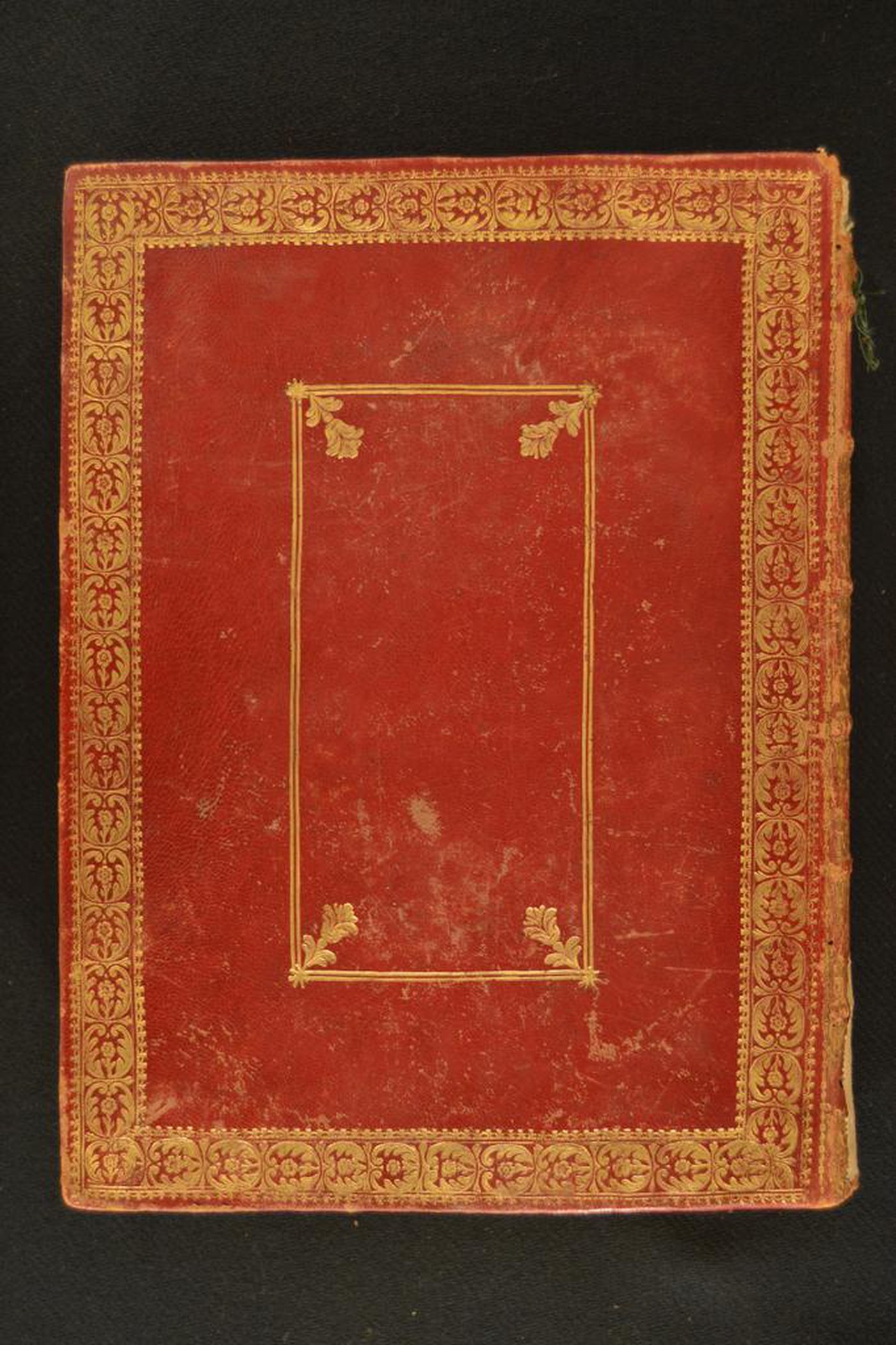 Cuoio di capra su quadranti in cartone decorato in oro. Cornice caratterizzata da fiorami entro coppie di fogliami. Motivo fogliato negli angoli interni dello specchio. Scompartimenti del dorso riquadrati. Nel secondo, il cognome dell’autore, il titolo dell’opera e la partizione del volume; fogliami negli angoli interni e motivo fitomorfo in quelli residui. Capitelli muniti di anima in seta verde. Cucitura su sei nervi rilevati. Indorsatura realizzata tramite alette orizzontali. Labbri muti. Rimbocchi non osservabili. Carte di guardia silografate policrome provviste di steli fogliati, fiorami, e bianche. Tagli dorati brillanti incisi. Stato di conservazione: mediocre - discreto. Materiale di copertura parzialmente scomparso in testa al dorso. Piatto anteriore in fase di distacco. Angoli ricurvi, sbrecciati al piatto posteriore.