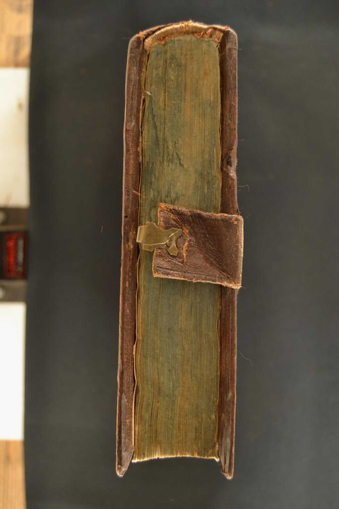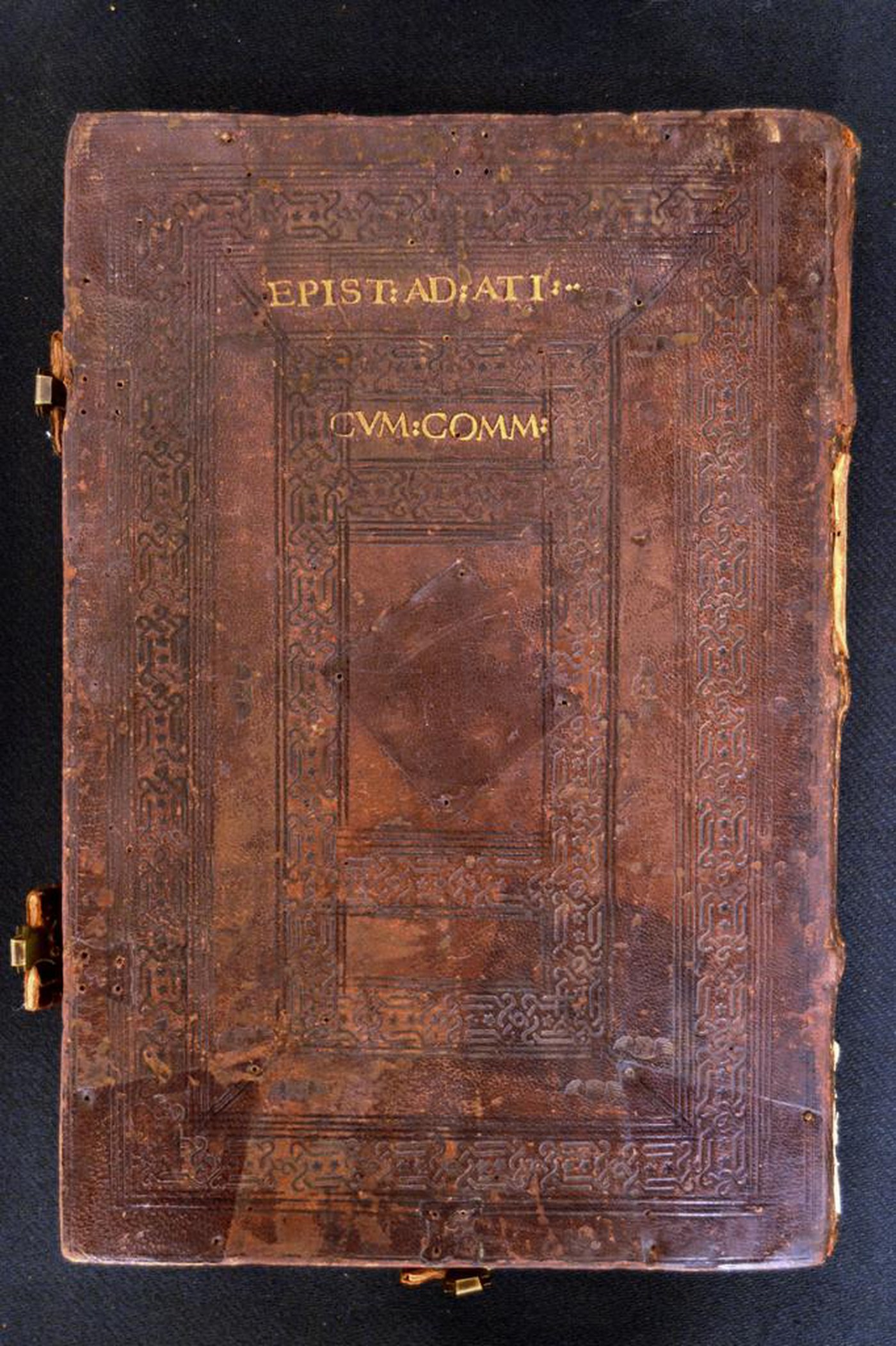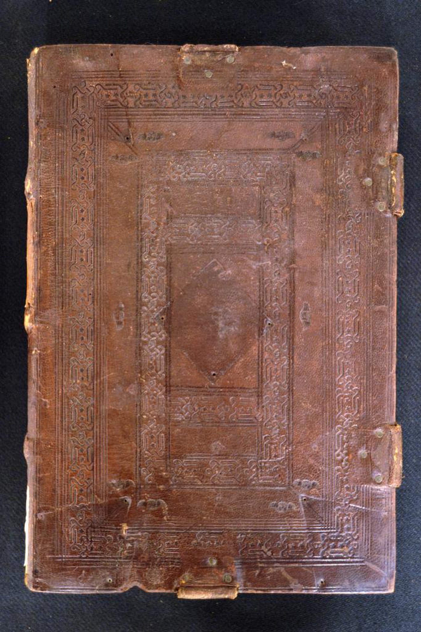 Cuoio di capra bruno su assi lignee smussate ai contropiatti in corrispondenza dei tagli, decorato a secco e in oro. Filetti concentrici. Tre cornici caratterizzate da serie di due minute stelle entro cordami e testine di cherubino alate. Il titolo dell’opera in testa al piatto posteriore. Tracce di quattro cantonali, umbone entro sfondo losangato e quattro fermagli, questi ultimi costituiti da altrettante bindelle in cuoio bruno ancorate a mezzo di tre chiodi metallici a testa circolare ancorate al piatto anteriore e da due paia di impronte provviste di quattro chiodi assicurate a quello posteriore. Filetti diagonali incrociati negli scompartimenti del dorso, tranne nel secondo in cui campeggiano gli estremi dell’opera. Capitello scomparso in testa, munito di fili canapa e resti di fili in seta rosa a quello al piede. Cucitura su tre nervi in pelle allumata fendue. Indorsatura realizzata tramite alette orizzontali cartacee. Rimbocchi rifilati senza particolare cura. Carte di guardia bianche. Tagli turchesi. Stato di conservazione: mediocre. Piatto anteriore distaccato dal blocco a fronte di quello posteriore in fase di distacco.