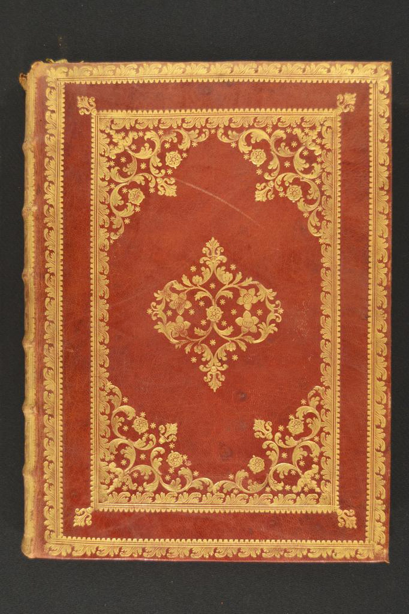 Cuoio di capra rosso su quadranti in cartone decorato in oro. Coppia di cornici concentriche caratterizzate da fogliami ondivaghi, monticelli. Corolla fogliata negli angoli esterni. Negli angoli interni dello specchio fronde mosse, rosette pentalobate e minute stelle eptalobate. Cartella centrale fitomorfa. Scompartimenti del dorso riquadrati. Nel secondo scompartimento, il titolo dell’opera; fogliame mosso negli angoli interni e corolla fogliata centrale in quelli residui. Capitelli muniti di anima circolare avvolta da fili in lino bianco e verde. Cucitura su cinque nervi rilevati. Indorsatura non osservabile. Rimbocchi rifilati senza particolare cura. Carte di guardia sbruffate rosa e bianche. Tagli dorati brillanti. Stato di conservazione: discreto. Spellature e bruniture al materiale di copertura dalla tonalità scolorita lungo il dorso, ivi parzialmente scomparso in testa. Angoli di piede sbrecciati.