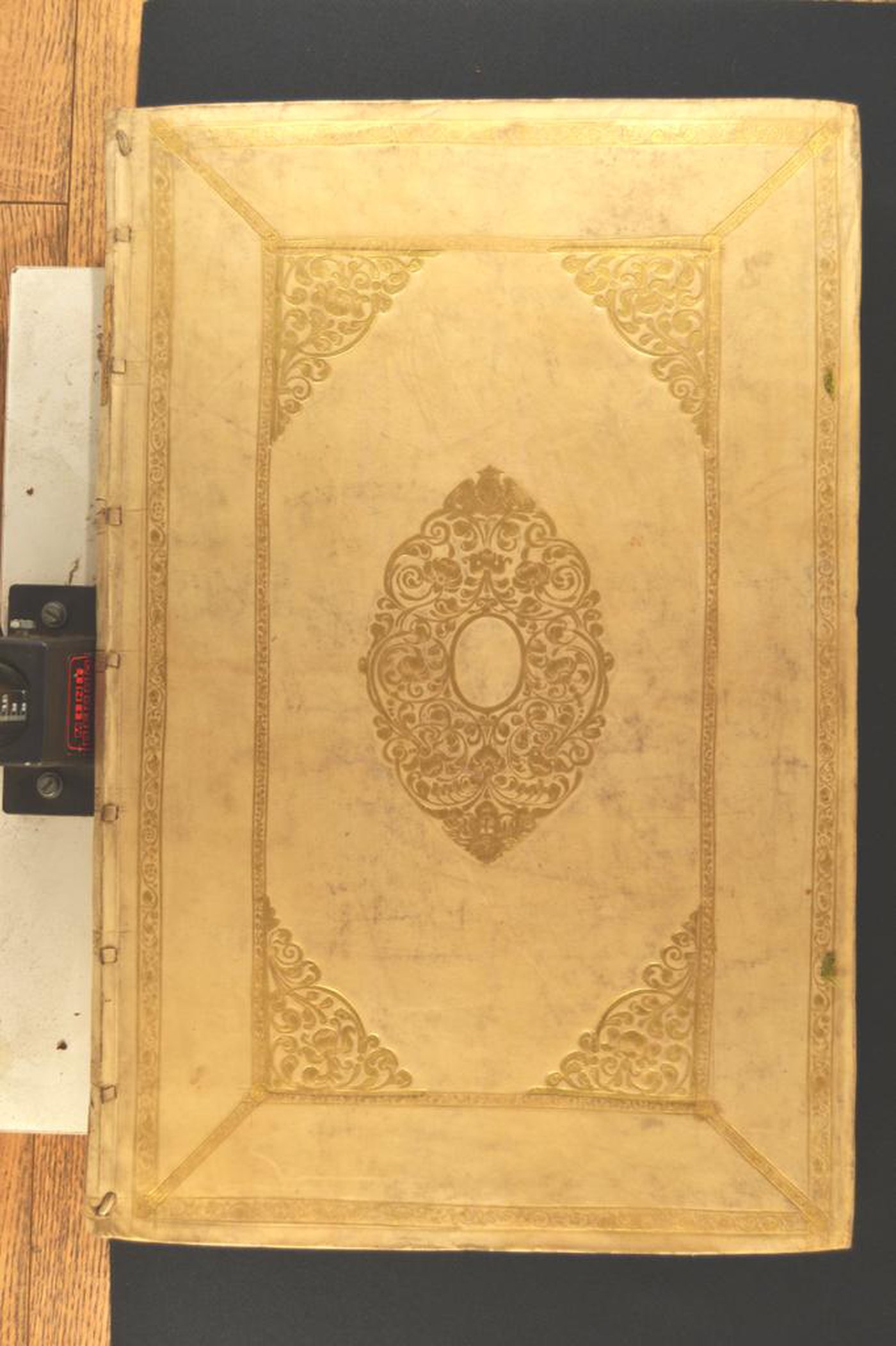 Pergamena rigida decorata in oro. Coppia di cornici concentriche collegate agli angoli, caratterizzate da fogliami e fiorami. Placca negli angoli e centrale (170x110 mm) fitomorfe. Tracce di due coppie di lacci in tessuto verde. Nel secondo scompartimento del dorso liscio, il titolo dell’opera entro il tassello marrone; rosetta in quelli residui, Capitelli muniti di anima rettangolare in pergamena passante avvolta da fili in lino azzurro. Cucitura su sette nervi passanti in pergamena. Indorsatura realizzata tramite aletta verticale cartacea. Rimbocchi accuratamente rifilati. Carte di guardia bianche. Tagli rustici spruzzati di rosso. Stato di conservazione: discreto. Marginali gore nere.