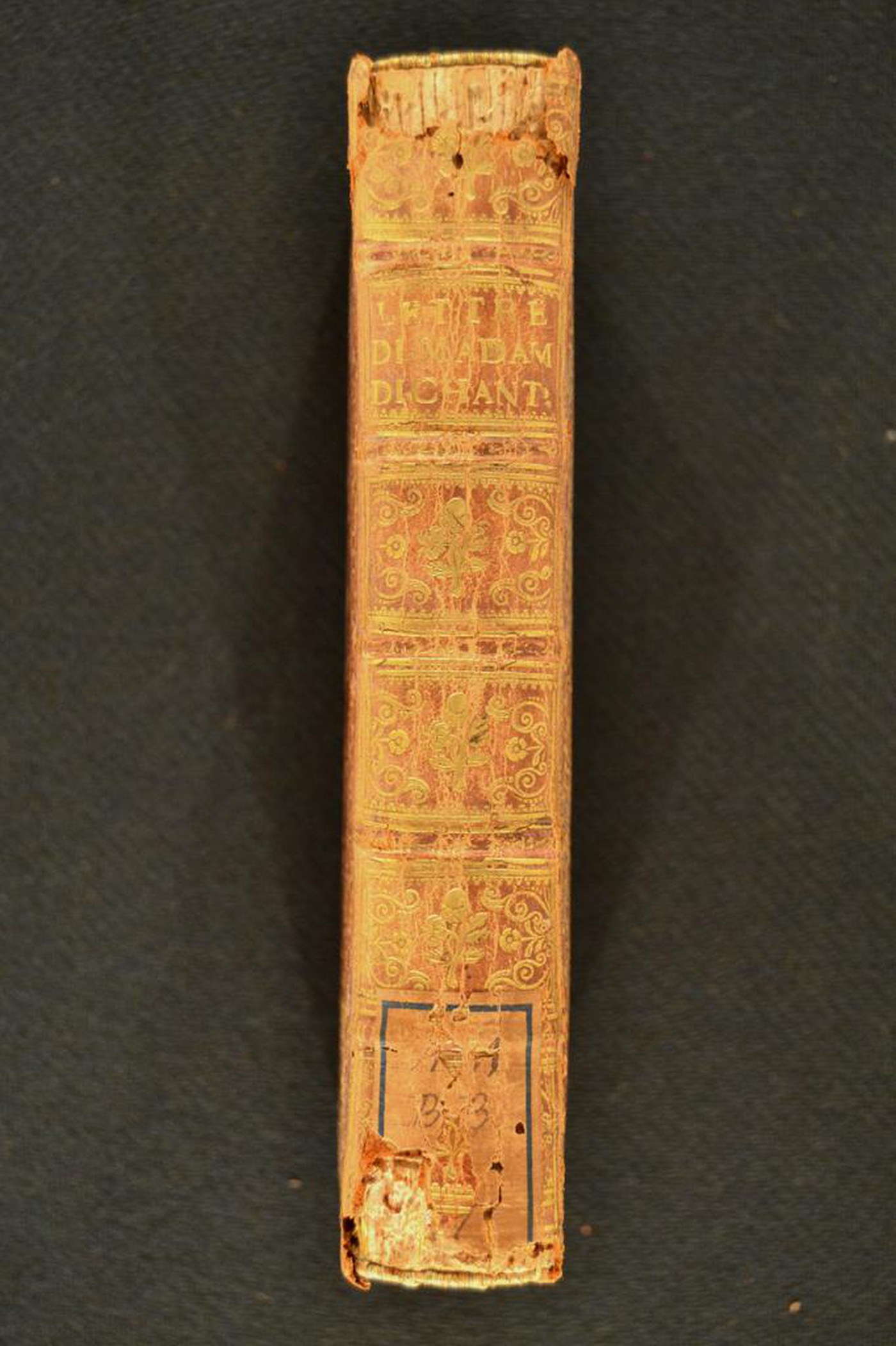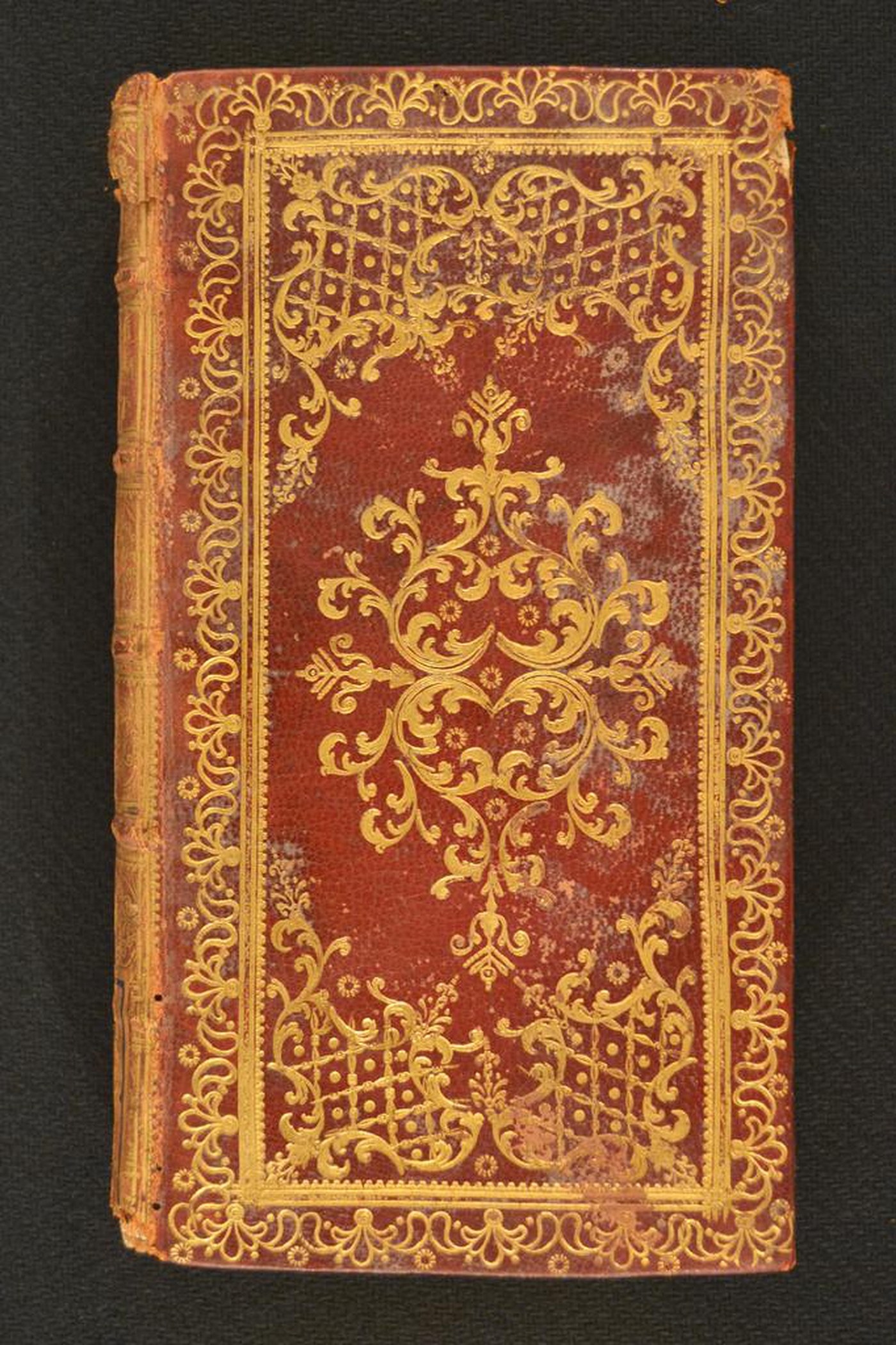 Cuoio di capra rosso su quadranti in cartone decorato in oro. Cornice caratterizzata da palmette svasate alternate a coppie di fogliami stilizzati muti. Margini interni dello specchio provvisti di monticelli, tralicci, cerchielli forati, fogliami, questi ultimi ripresi nella cartella centrale e affiancata da corolle stilizzate. Scompartimenti del dorso riquadrati. Nel secondo, il titolo dell’opera e il cognome dell’autrice; coppie di volute negli angoli interni e fregio fitomorfo centrale in quelli residui. Capitelli muniti di anima circolare avvolta da fili in canapa e lino rosa e verde. Cucitura su cinque nervi rilevati. Indorsatura realizzata tramite alette orizzontali cartacee. Labbri ornati con fogliami. Rimbocchi accuratamente rifilati. Carte di guardia goffrate turchesi entro sfondo dorato a raffigurare steli fogliati, fiorami e bianche. Tagli dorati brillanti incisi Stato di conservazione: mediocre – discreto. Gore grigiastre al materiale di copertura dalla tonalità scolorita lungo il dorso, parzialmente scomparso in testa e al piede. Angoli ricurvi, sbrecciati in testa.