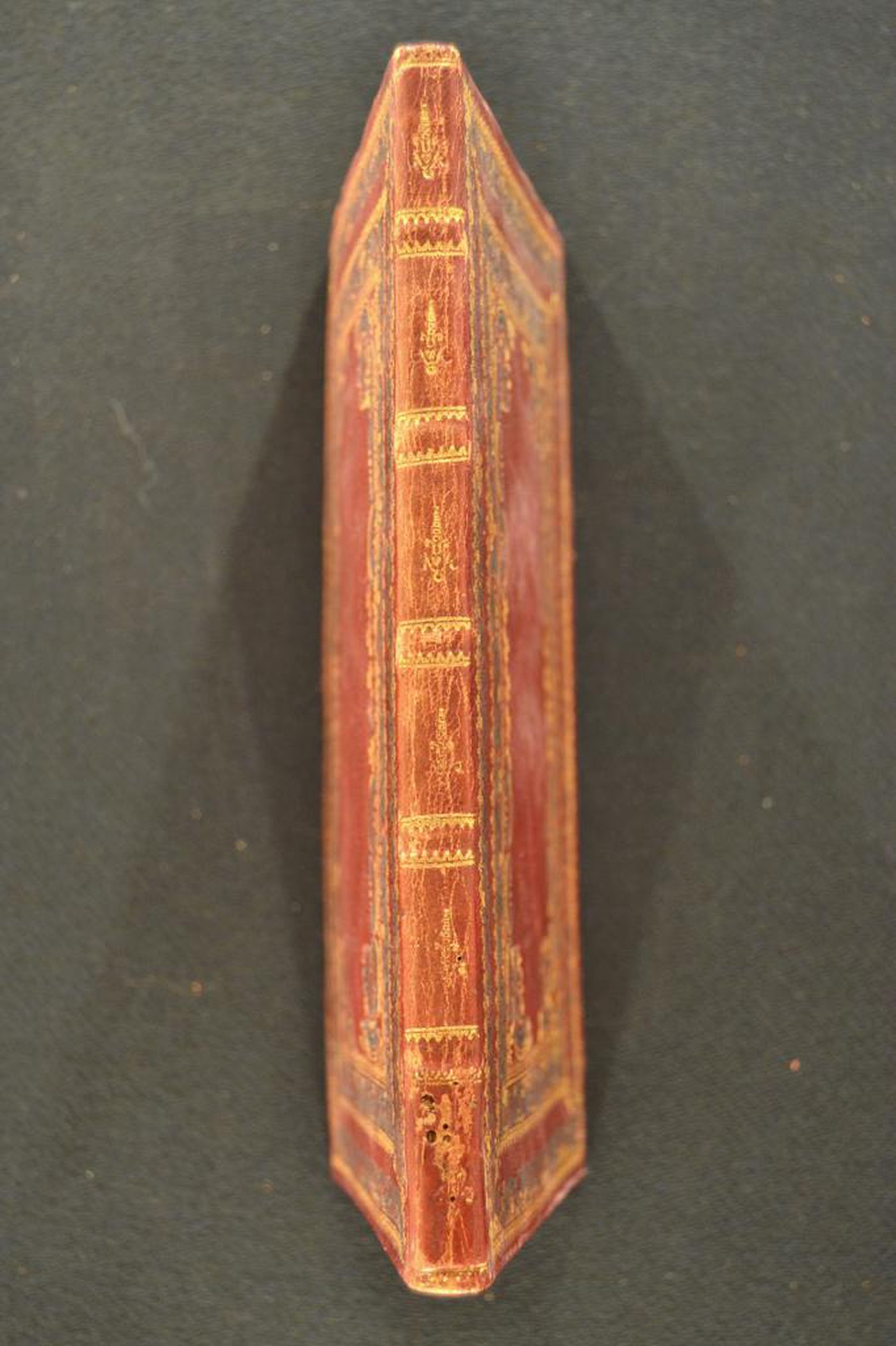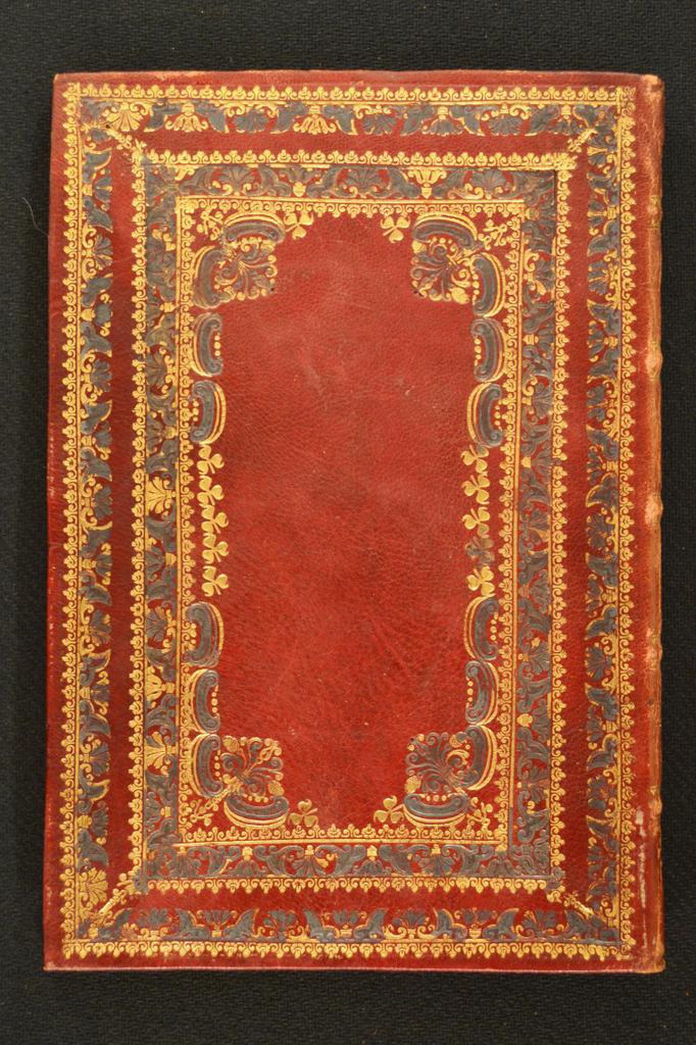 Cuoio di capra rosso su quadranti in cartone decorato in oro e a colore. Coppia di cornici concentriche e margini interni dello specchio caratterizzati da motivi stilizzati, palmette alternate a corolle trilobate entro nastri (motivi questi ripresi lungo i labbri), motivi a culla e fitomorfi rilevati in pasta blu e foglie piene. Corolla stilizzata negli scompartimenti del dorso liscio. Capitelli muniti di anima circolare avvolta da fili in seta bianca e verde. Cucitura su cinque nervi. Indorsatura realizzata tramite alette orizzontali cartacee. Rimbocchi discretamente rifilati. Carte di guardia bianche. Tagli dorati brillanti. Stato di conservazione: discreto - buono. Marginali spellature e bruniture al materiale di copertura.