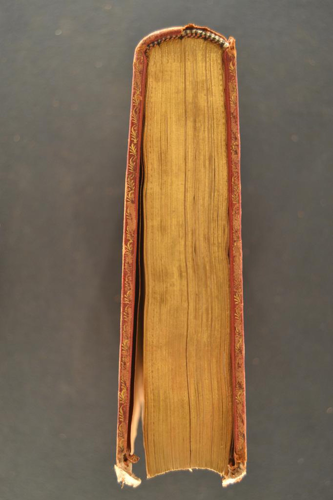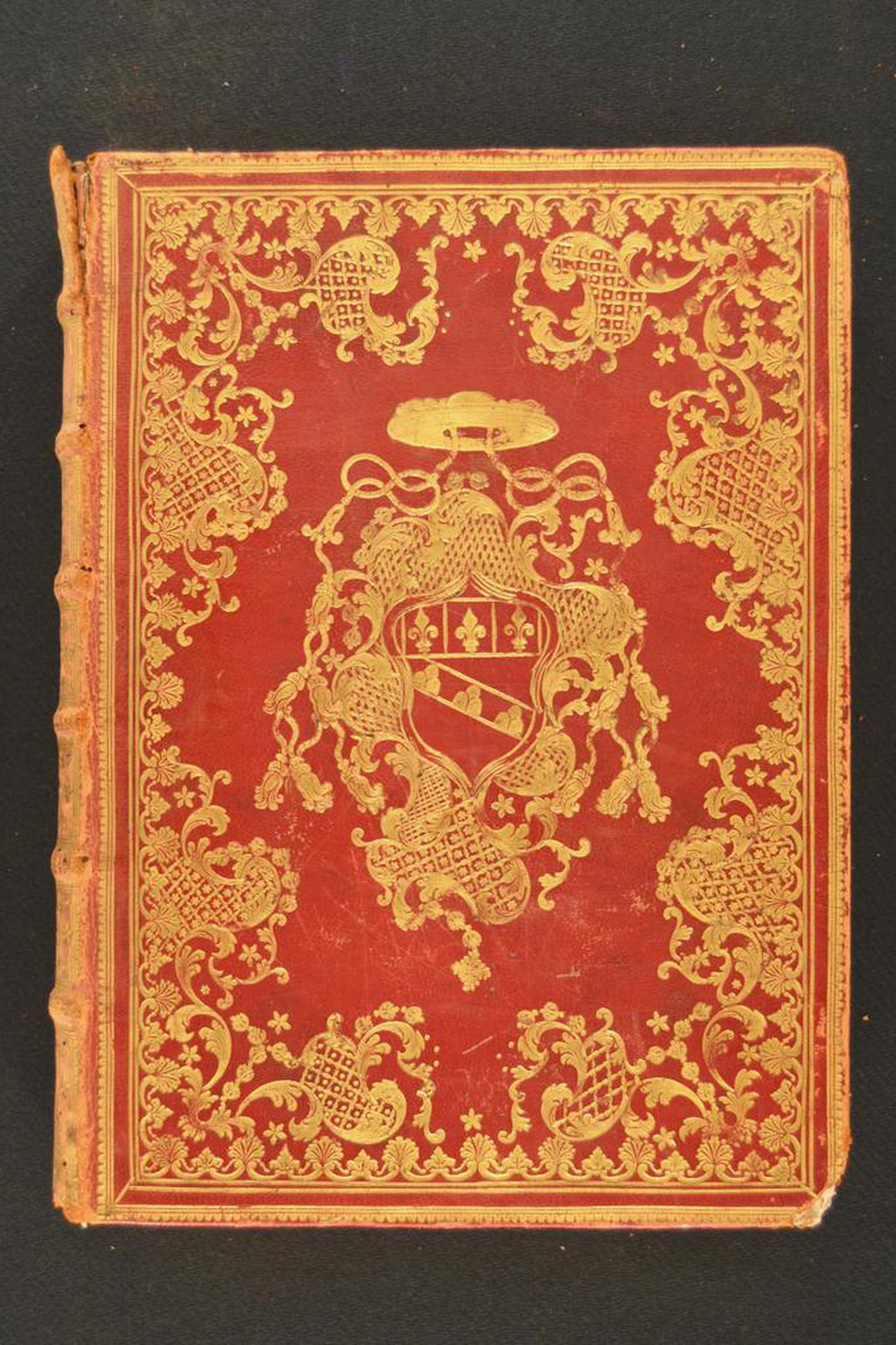 Cuoio di capra rosso su quadranti in cartone decorato in oro. Cornice costituita da monticelli e due coppie di filetti concentrici collegati agli angoli. Margine interno dello specchio caratterizzato da archi sormontati da palmette e corolle trilobate, minute stelle a cinque punte, fogliami mossi, graticci. Armi prelatizie (110x105 mm). Scompartimenti del dorso riquadrati, Nel secondo, il cognome dell’autore e il titolo dell’opera; fogliami mossi, stelle pentalobate, due suonatori di tuba addossati sormontati da ombrellino in quelli residui. Capitelli costituiti da due anime circolari avvolte da fili in canapa, in seta azzurra e blu. Cucitura su sei nervi rilevati. Indorsatura costituita da alette cartacee orizzontali. Labbri ornati con fogliami. Rimbocchi discretamente rifilati. Carte di guardia sbruffate rosa e bianche. Tagli dorati brillanti incisi. Stato di conservazione: discreto. Marginali spellature e bruniture al materiale di copertura dalla tonalità scolorita lungo il dorso. Cerniere indebolite ai piatti. Angoli parzialmente sbrecciati.