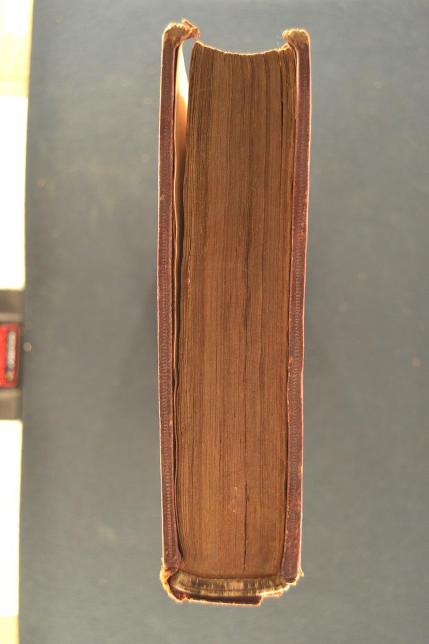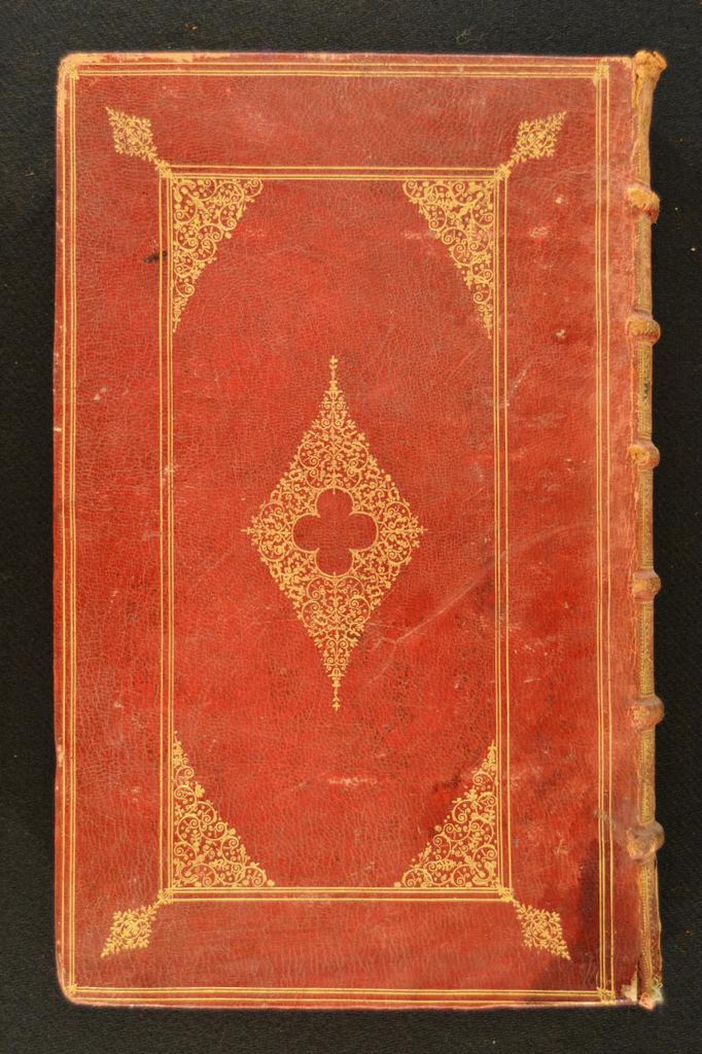 Cuoio di capra rosso su quadranti in cartone decorato in oro. Due cornici all’antica. Fiorame entro sfondo ovale affiancato da coppia di corolle e fogliami stilizzati negli angoli esterni del riquadro interno. Grottesche, stelline, vasi fioriti, cerchielli pieni negli angoli interni dello specchio, motivi ripresi nella losanga centrale caratterizzata da quattro archi affrontati a delimitare lo spazio muto. Scompartimenti del dorso riquadrati. Nel secondo, il cognome dell’autore e il titolo dell’opera; punte, volute caudate e quattro corolle addossate centrali in quelli residui. Capitello di testa scomparso, munito di doppia anima circolare avvolta da fili in seta bianca, rosa e verde al piede. Cucitura su sei nervi rilevati. Indorsatura realizzata tramite alette orizzontali cartacee. Labbri ornati con punte. Rimbocchi rifilati senza particolare cura. Margini dei contropiatti, rivestiti da foglio in carta marmorizzata pettinata fine, ornati a pizzo. Carte di guardia bianche. Tagli dorati. Stato di conservazione: mediocre - discreto. Spellature e bruniture al materiale di copertura. Piatto anteriore in fase di distacco. Angoli ricurvi e sbrecciati.