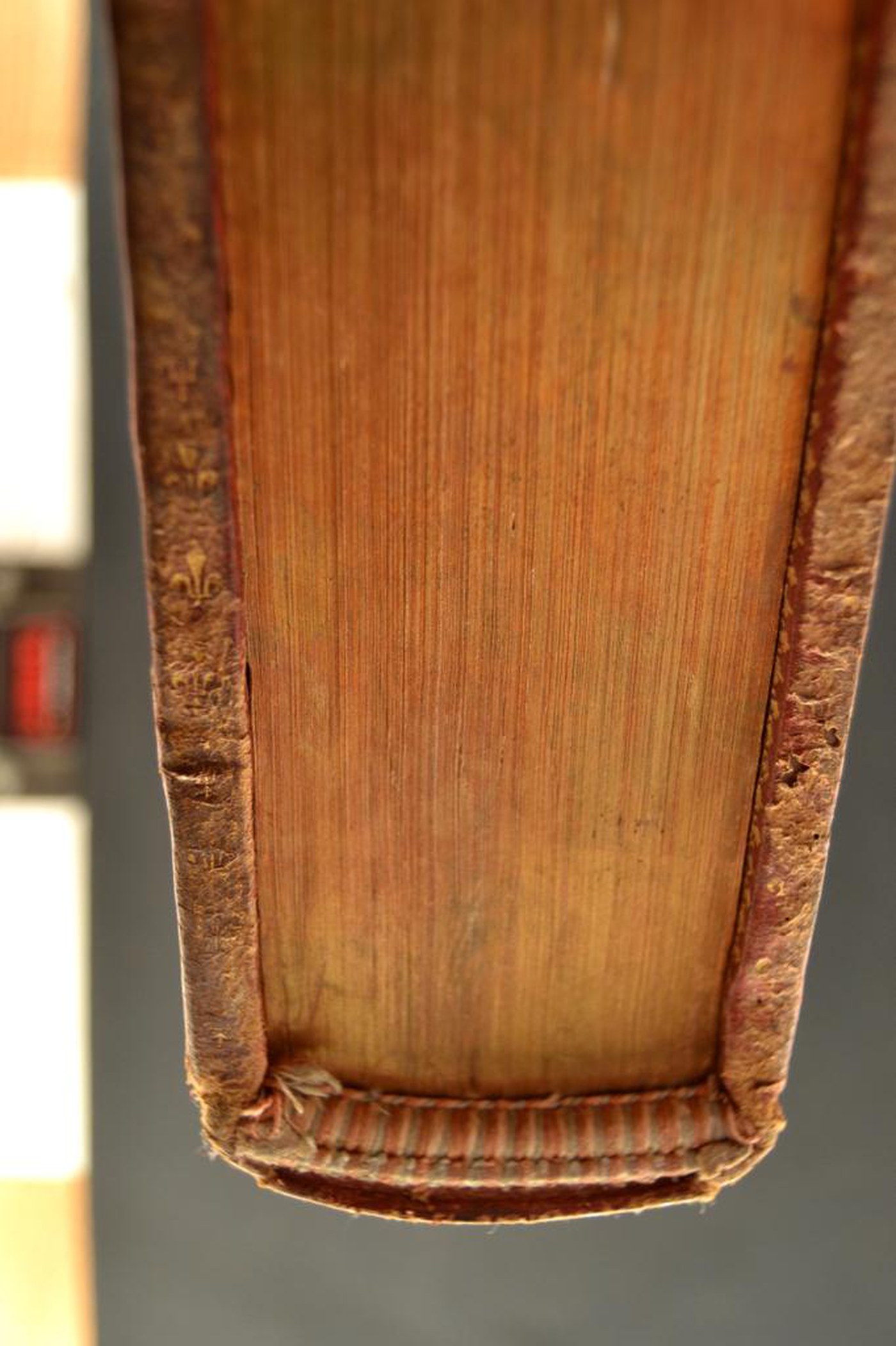Il decoro a seminato, i capitelli a doppia anima, l’indorsatura realizzata tramite aletta cartacea in foggia di trapezio, le carte di guardia marmorizzate policrome pettinate fini e le note tipografiche consentono di assegnare la legatura alla metà del XVII secolo eseguita in Francia, a Parigi in particolare considerato il ruolo egemone svolto dalla ville lumière nel commercio librario transalpino da atelier non riferibile alla bottega di Pierre Rocolet in virtù dei differenti motivi. In evidenza i tagli marmorizzati.