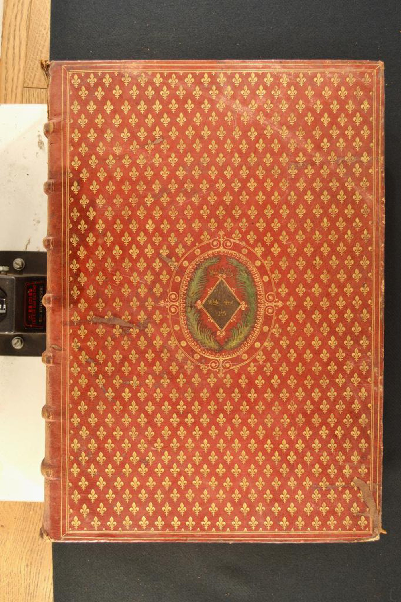 Cuoio di capra rosso su quadranti in cartone decorato in oro e a colori. Cornice all’antica. Specchio caratterizzato da seminato di gigli ripresi negli scompartimenti del dorso tranne nel secondo in cui campeggiano il titolo dell’opera e il cognome dell’autore, e da losanga sormontata da ampia corona a otto punte, provvista di doppia voluta caudata alle estremità e di tre corone interne entro coppia di rami di alloro rilevati in pasta verde su sfondo ovale (120x95 mm) ornato con rosette, volute filigranate e corolle stilizzate. Capitelli muniti di due anime circolari avvolte da fili in seta bianca, rosa azzurra. Cucitura su sette nervi rilevati. Indorsatura realizzata tramite aletta cartacea sotto forma di trapezio. Labbri provvisti di gigli. Rimbocchi rifilati senza particolare cura; margini decorati a pizzo. Carte di guardia marmorizzate policrome pettinate fini e bianche. Tagli dorati marmorizzati. Stato di conservazione: discreto. Spellature e bruniture al materiale di copertura. Cerniera indebolita in testa al piatto anteriore. Angoli parzialmente sbrecciati.