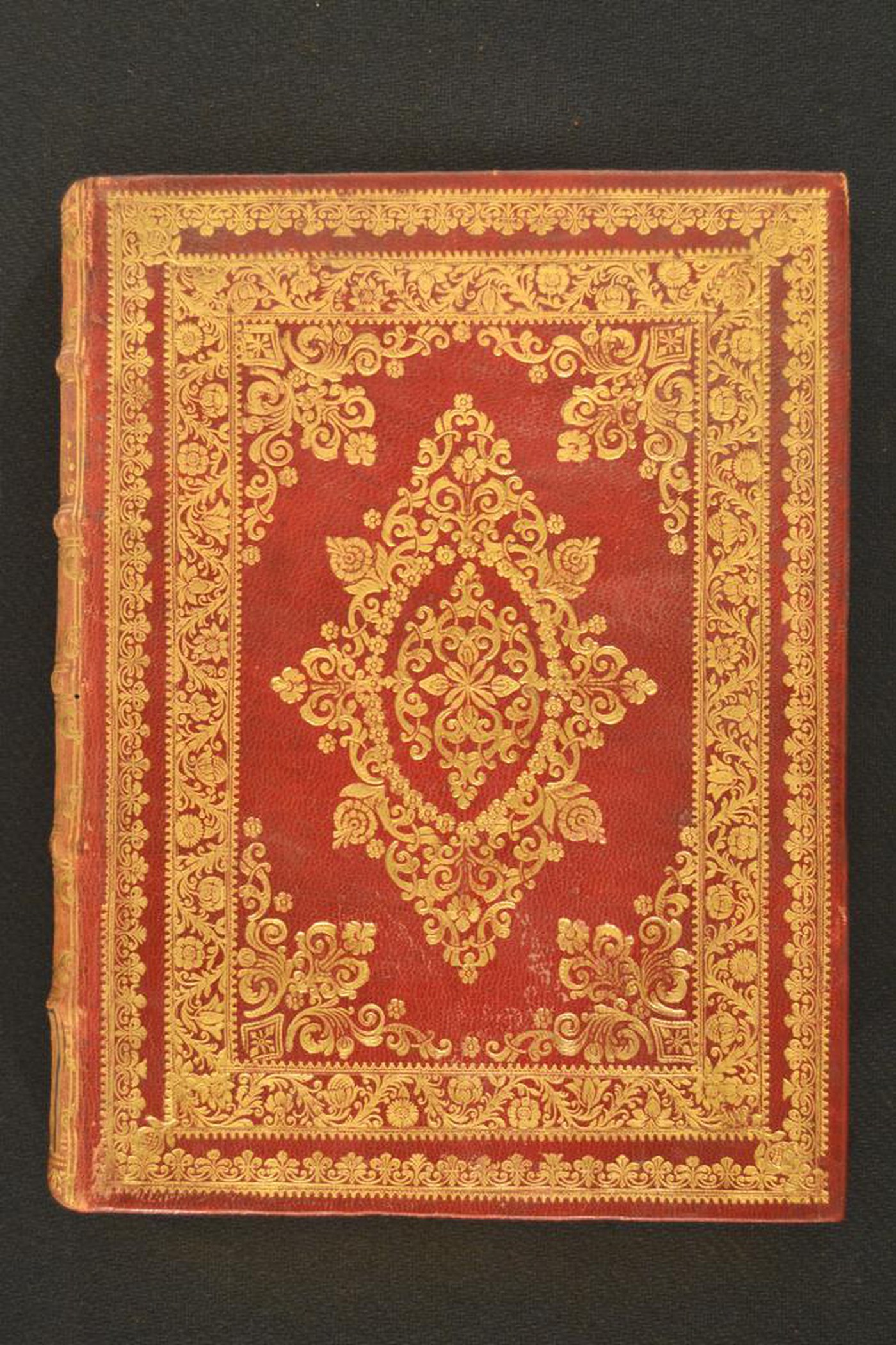 Cuoio di capra rosso su quadranti in cartone decorato in oro. Coppia di cornici concentriche caratterizzate da archi sormontati da gigli e motivi fitomorfi, fiorami entro corni d’abbondanza. Margini interni dello specchio provvisti di losanghe dal margine concavo, fronde, motivi di gusto aldino, ripresi nell’ampia cartella centrale. Scompartimenti del dorso riquadrati. Nel secondo, il titolo dell’opera e il nome dell’autore; fogliame negli angoli interni e motivo fitomorfo centrale in quelli residui. Capitelli muniti di anima circolare avvolta da fili in canapa e in lino blu. Cucitura su cinque nervi rilevati. Indorsatura realizzata tramite alette orizzontali cartacee. Labbri e margini interni dei contropiatti ornati a pizzo. Rimbocchi rifilati senza particolare cura. Carte di guardia bianche. Tagli dorati brillanti incisi. Stato di conservazione: discreto - buono. Marginali bruniture al piatto posteriore; materiale di copertura dalla tonalità scolorita lungo il dorso.
