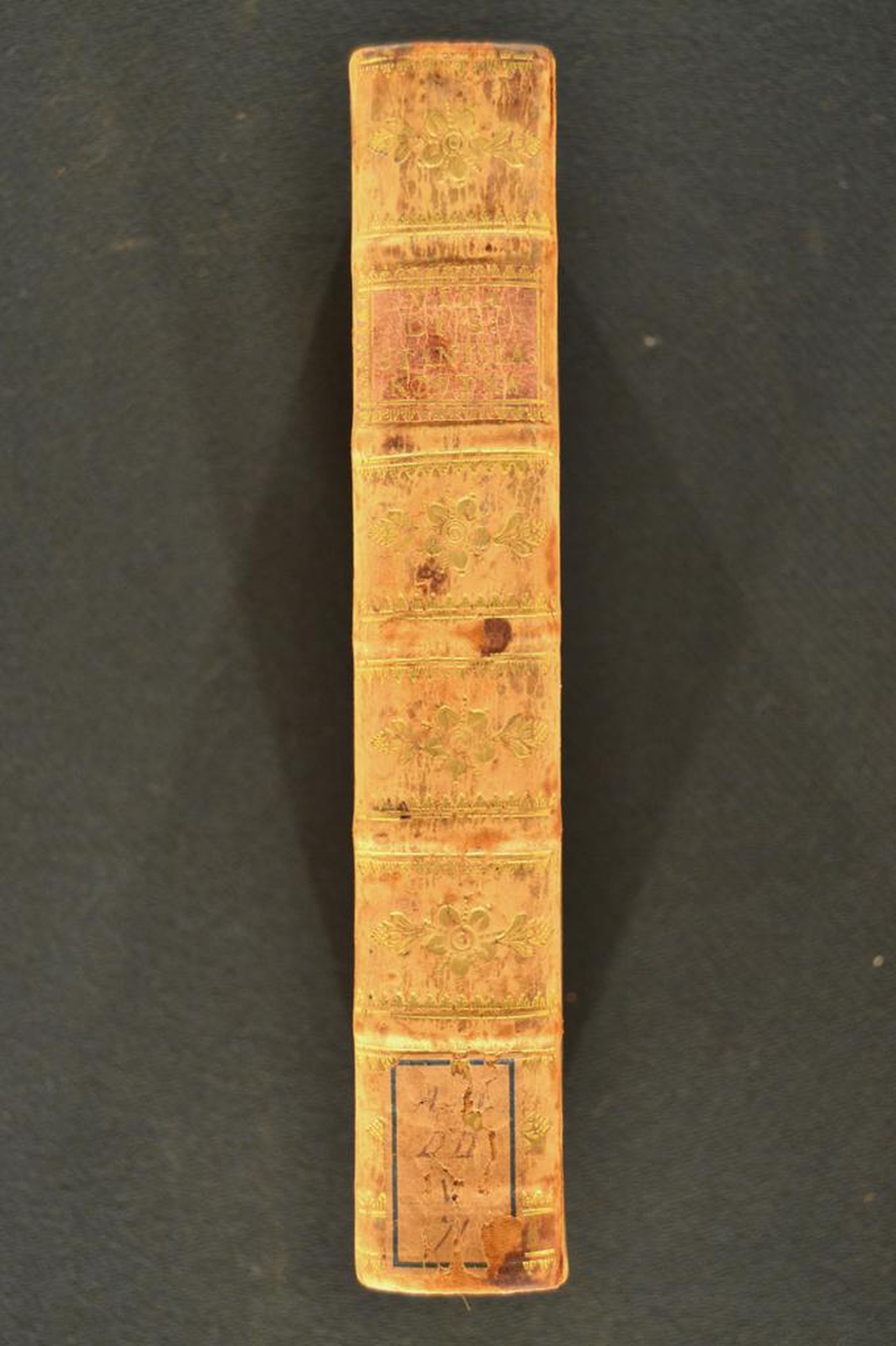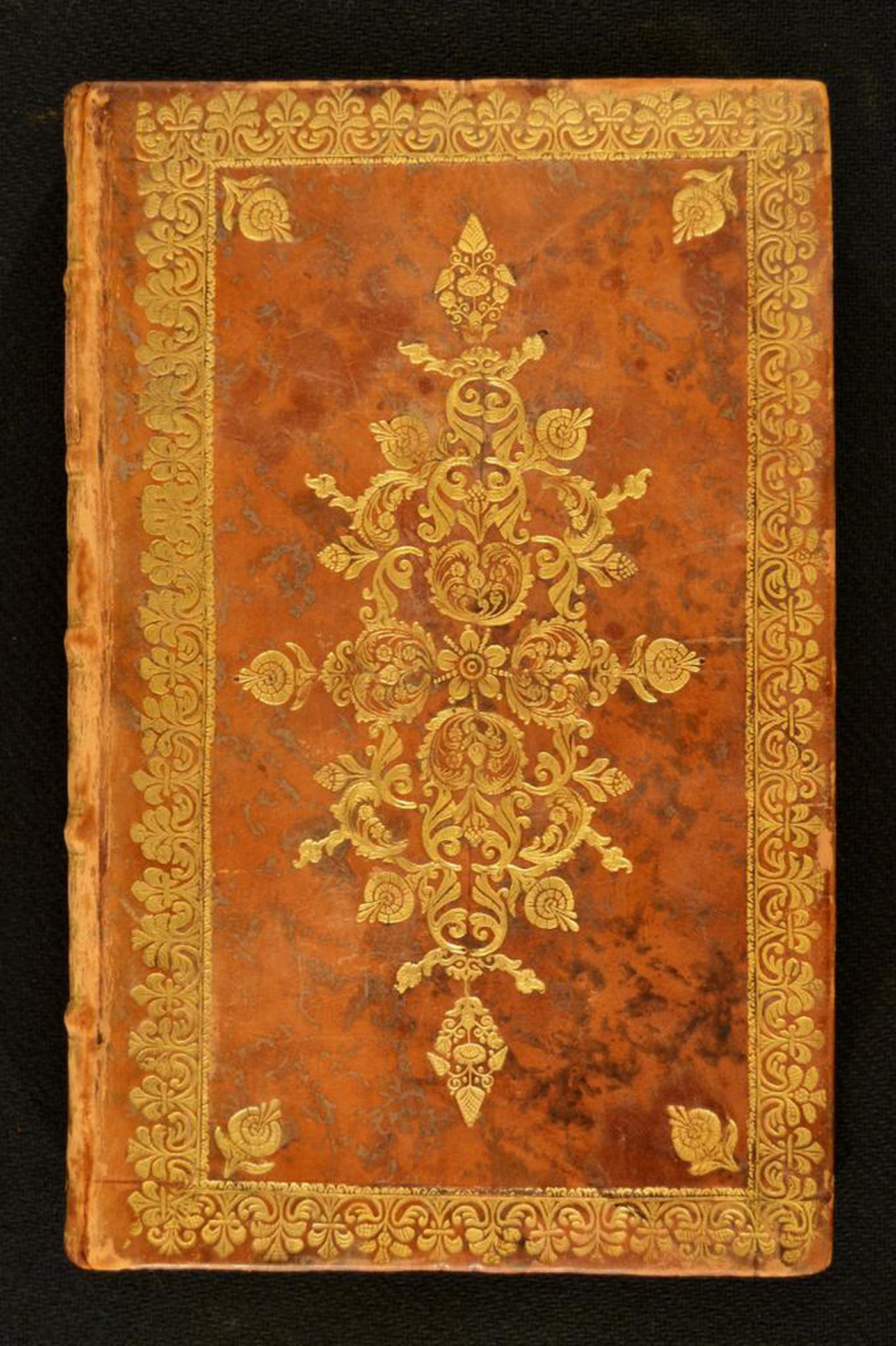 Cuoio di vitello marmorizzato marrone su quadranti in cartone decorato in oro. Cornice caratterizzata da archi sormontati da gigli e fregi fitomorfi. Garofano negli angoli interni dello specchio, ripreso nell’ampia cartella e affiancato da fogliami congiuntamente a rosetta pentalobata centrale. Scompartimenti del dorso riquadrati. Nel secondo il titolo dell’opera; coppia di fregi fitomorfi addossati in quelli residui. Capitelli muniti di anima circolare avvolta da fili in seta verde. Cucitura su cinque nervi rilevati. Indorsatura realizzata tramite alette orizzontali cartacee. Labbri ornati a pizzo. Rimbocchi accuratamente rifilati. Carte di guardia in tessuto di colore dorato. Tagli dorati brillanti incisi. Stato di conservazione: discreto. Materiale di copertura dalla tonalità scolorita lungo il dorso.