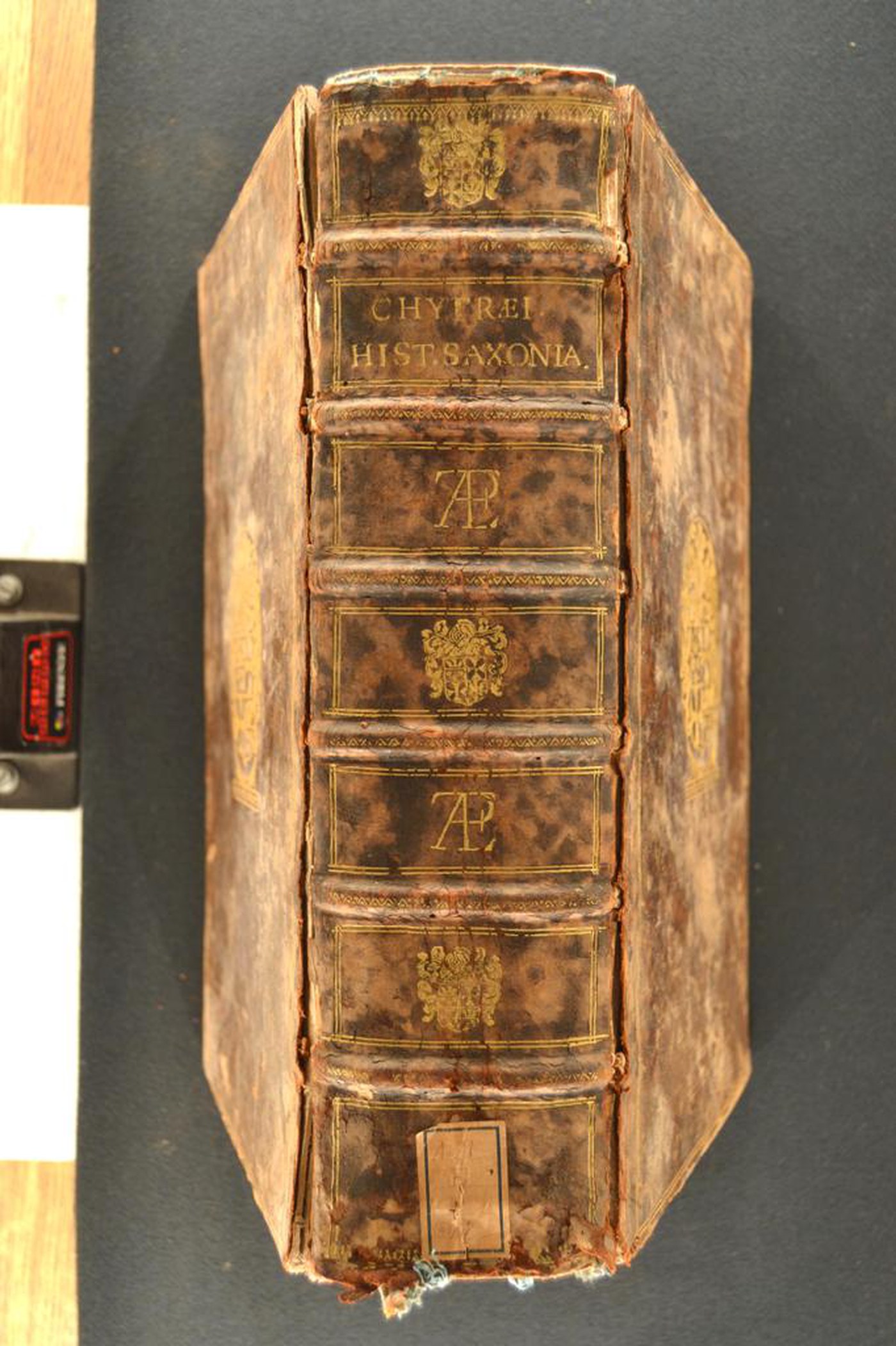 Chytraeus, David <1531-1600>, Dauidis Chytraei ... Saxonia, ab anno Christi 1500. vsque ad annum 1600, Nunc tertiùm recognita, & integri decennij accessione ad praesentem usque 1611. annum continuata. Additi sunt indices personarum & rerum maximè memorabilium copiosi, Lipsiae : sumtibus Henningi Grosii senioris bibliop., 1611 (Lipsiae : sumtibus Henningi Grosii senioris : excudebat Laurentius Cober : typis Tobiae Beyeri, 1611), 340x201x90 mm