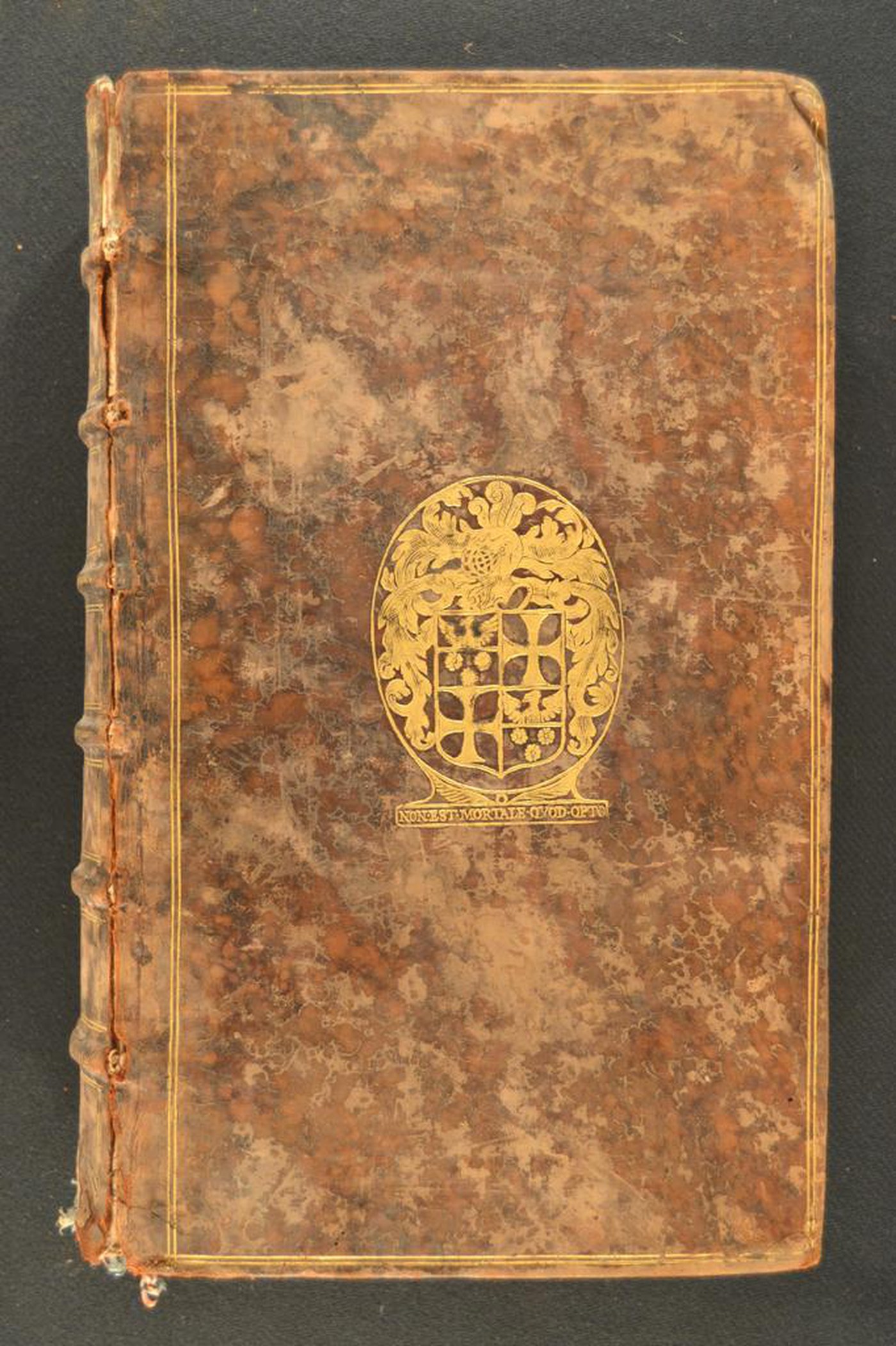 Cuoio di vitello marmorizzato marrone su quadranti in cartone decorato in oro. Cornice a due filetti. Armi (100x60 mm) provviste al piede dell’iscrizione «NON EST MORTALE QUOD OPTO», riferibili a Paul Pétau (1668-1713). Capitelli muniti di doppia anima circolare avvolta da fili in seta azzurri e rosa, in fase di distacco al piede. Cucitura su sei nervi rilevati. Scompartimenti del dorso riquadrati. Nel secondo, il cognome dell’autore e il titolo dell’opera; monogrammi complessi (P E T A V) e armi cimate in quelli residui. Indorsatura realizzata tramite aletta in foggia di trapezio. Rimbocchi rifilati senza particolare cura. Carte di guardia bianche. Tagli rustici e rossi. Stato di conservazione: mediocre. Angoli ricurvi. Piatti in fase di distacco causato dal rilevante peso del blocco.