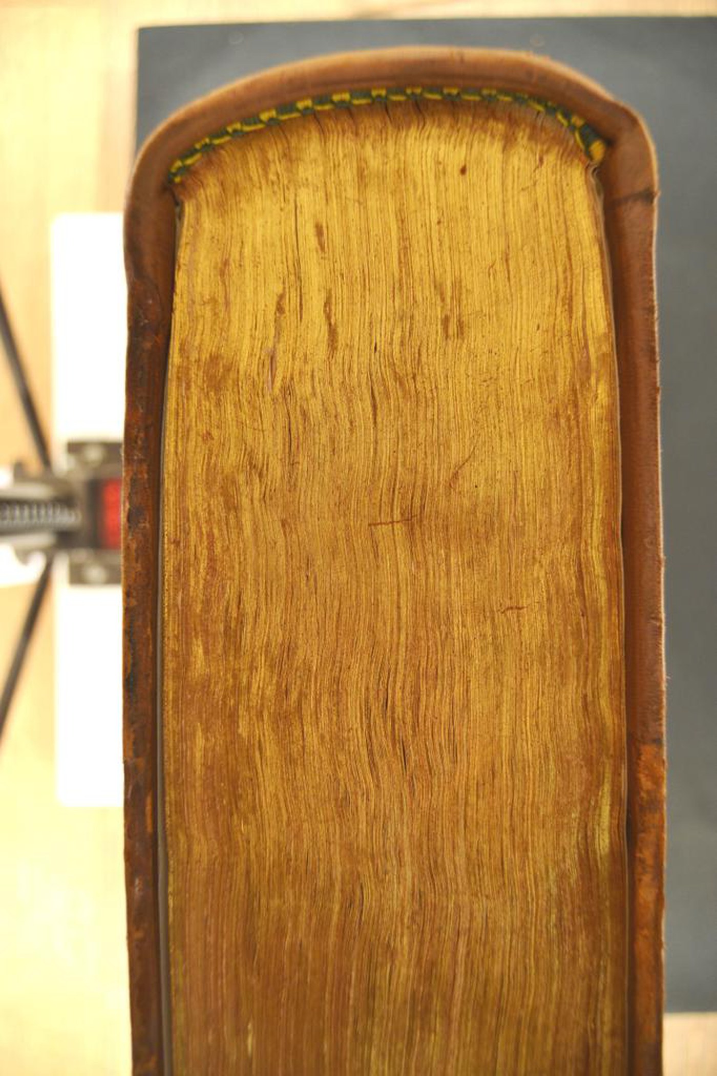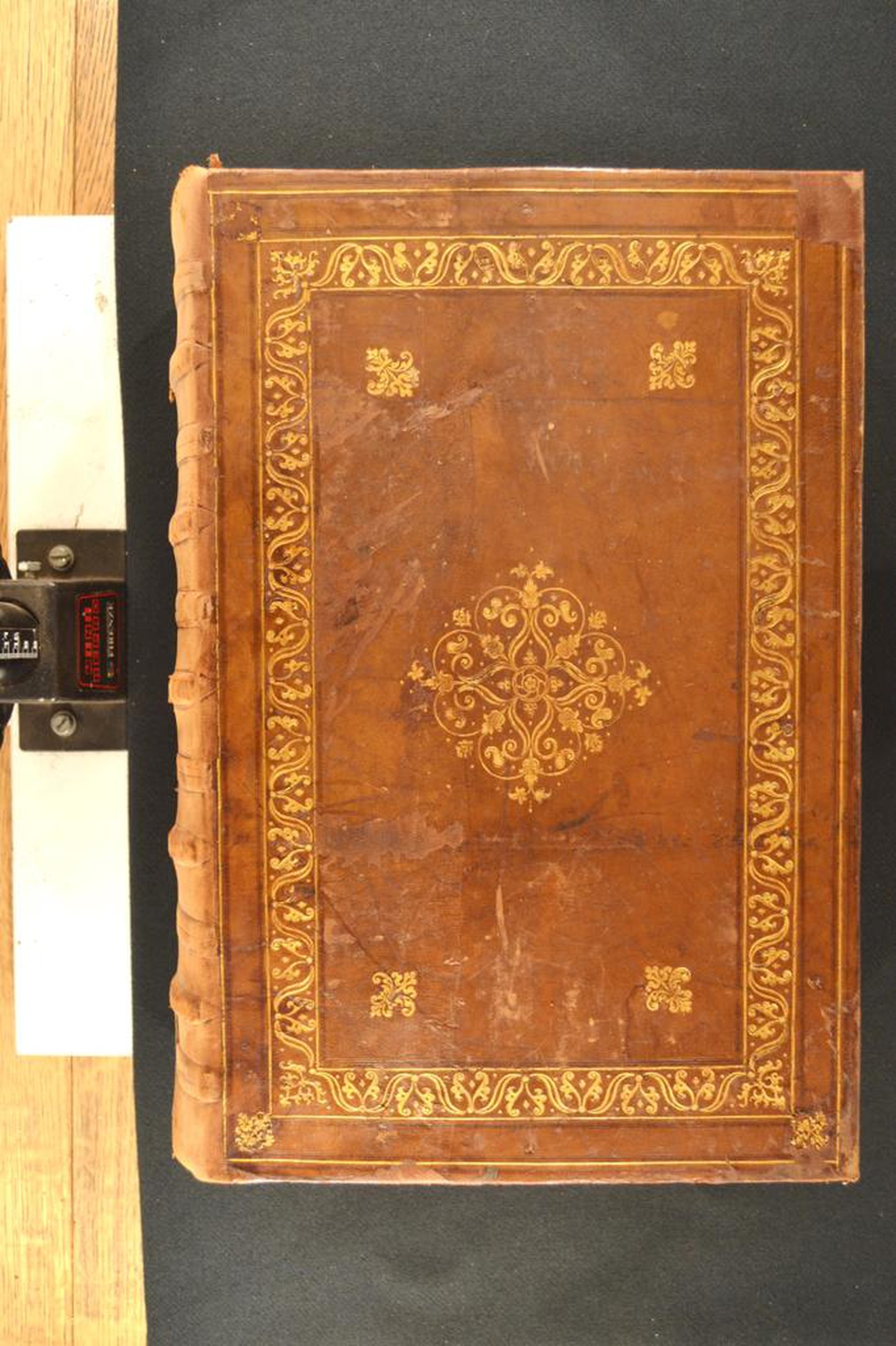 Cuoio di capra marrone su quadranti in cartone decorato a secco e in oro. Filetti concentrici. Coppia di cornici caratterizzate da quattro corolle stilizzate addossate e coppie di fogliami affrontati, cerchielli pieni, serpentine mute. Ampia cartella costituita da fregi fitomorfi archi e fregio ad elica centrale. Fregio pieno di gusto aldino negli angoli interni dello specchio. Capitelli, indorsatura e rimbocchi rinnovati. Cucitura su cinque nervi rilevati. Carte di guardia bianche restaurate e coeve. Tagli dorati. Stato di conservazione: mediocre. Spellature al materiale di copertura, restaurato al dorso.