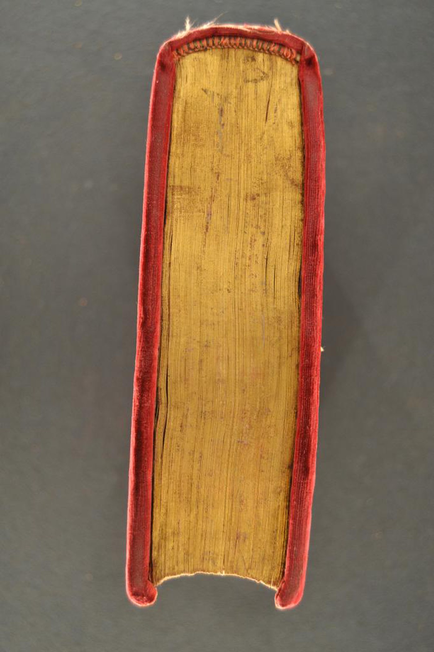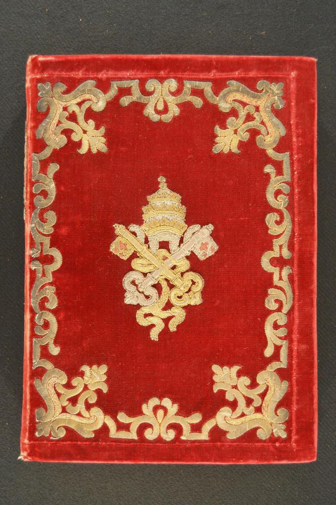Velluto rosso su quadranti in cartone ricamato a mezzo di fili dorati, argentati e colorati. Armi (110x70 mm) riferibili al papa Benedetto XIV (1740-1758). Capitelli muniti di anima circolare avvolta da fili in lino rosa e di colore argento. Cucitura su quattro nervi. Indorsatura realizzata tramite alette orizzontali cartacee. Rimbocchi discretamente rifilati. Carte di guardia goffrate e bianche. Tagli dorati. Stato di conservazione: discreto. Materiale di copertura liso lungo il dorso. Volume restaurato.
