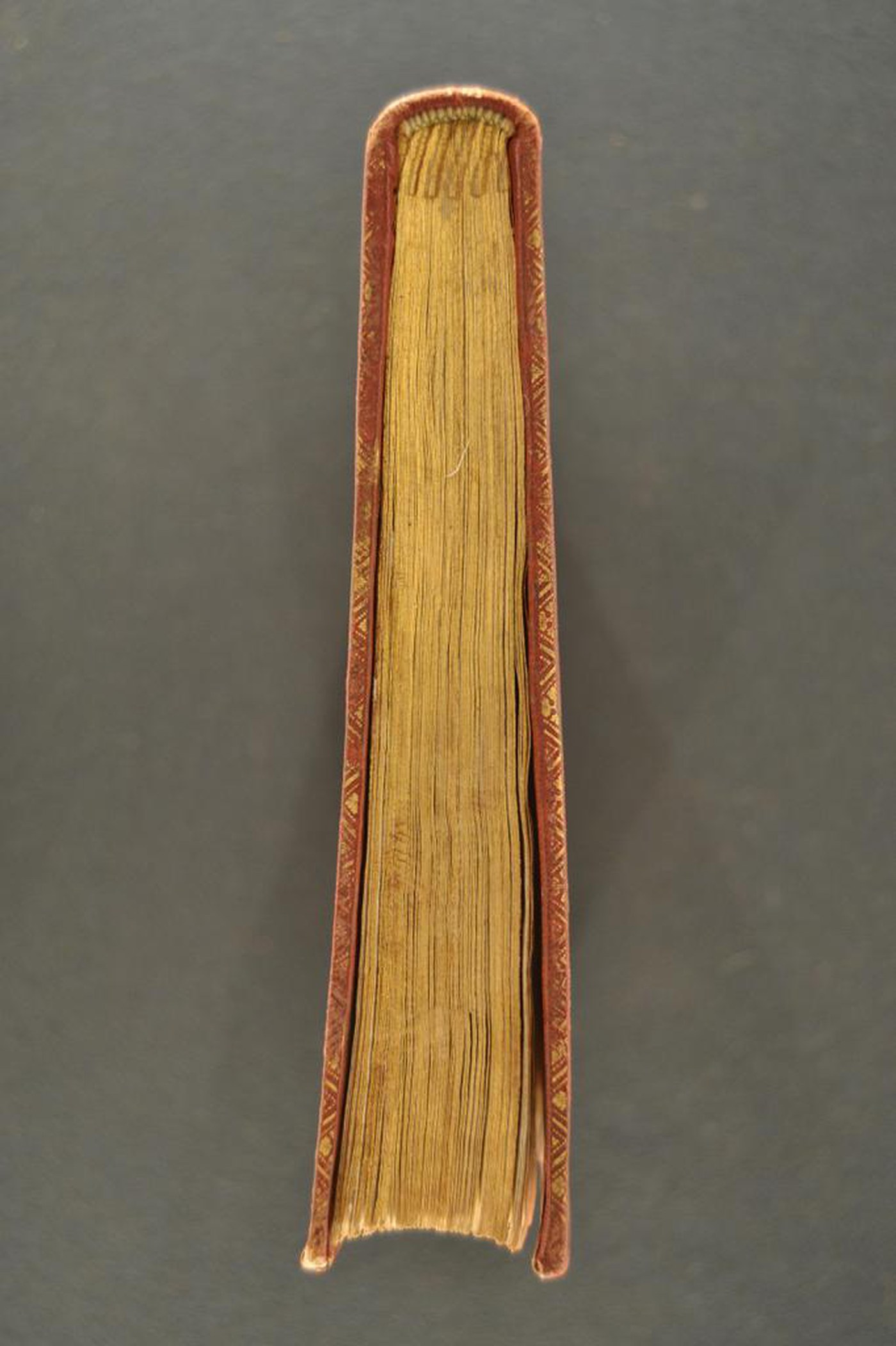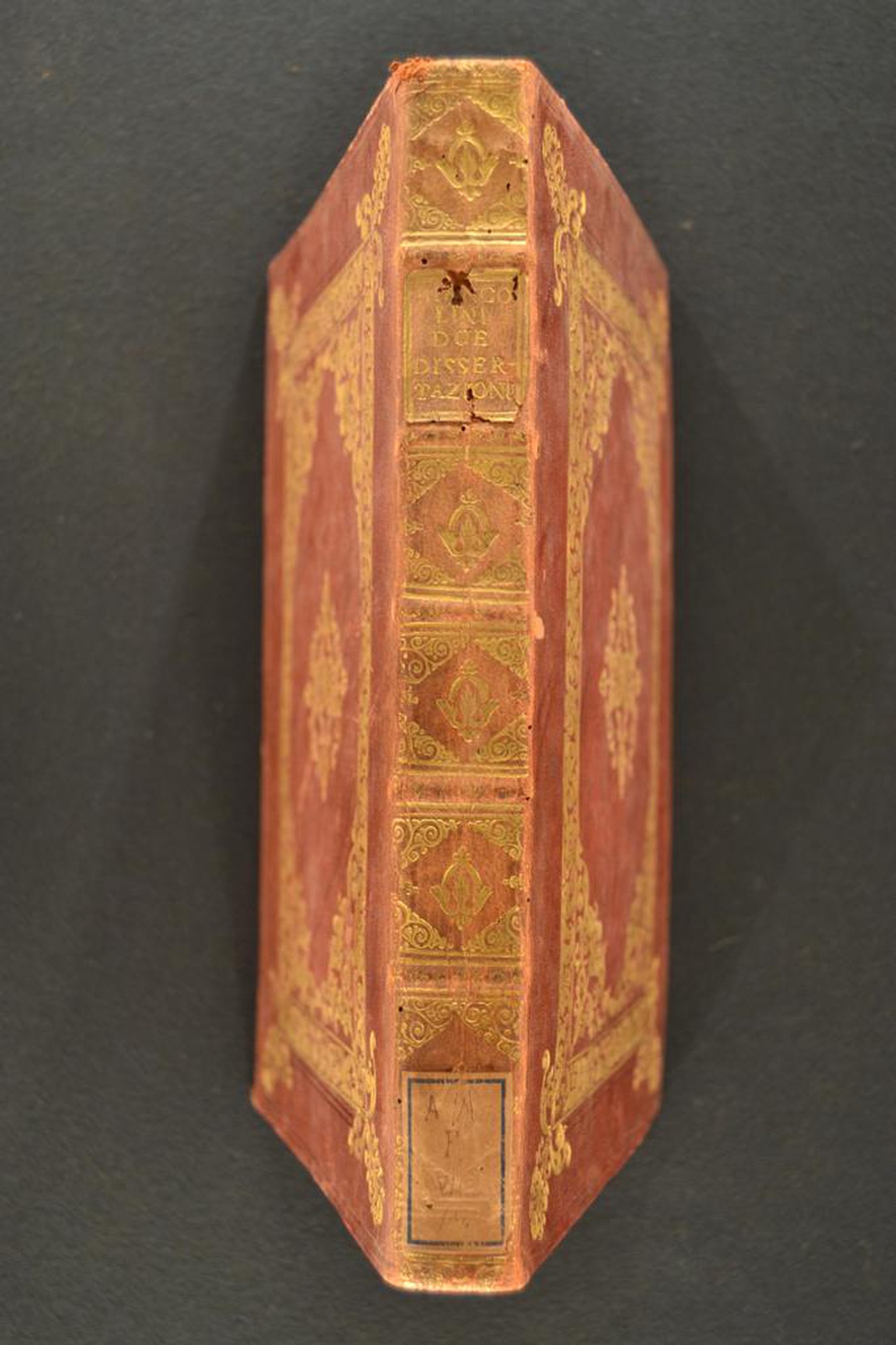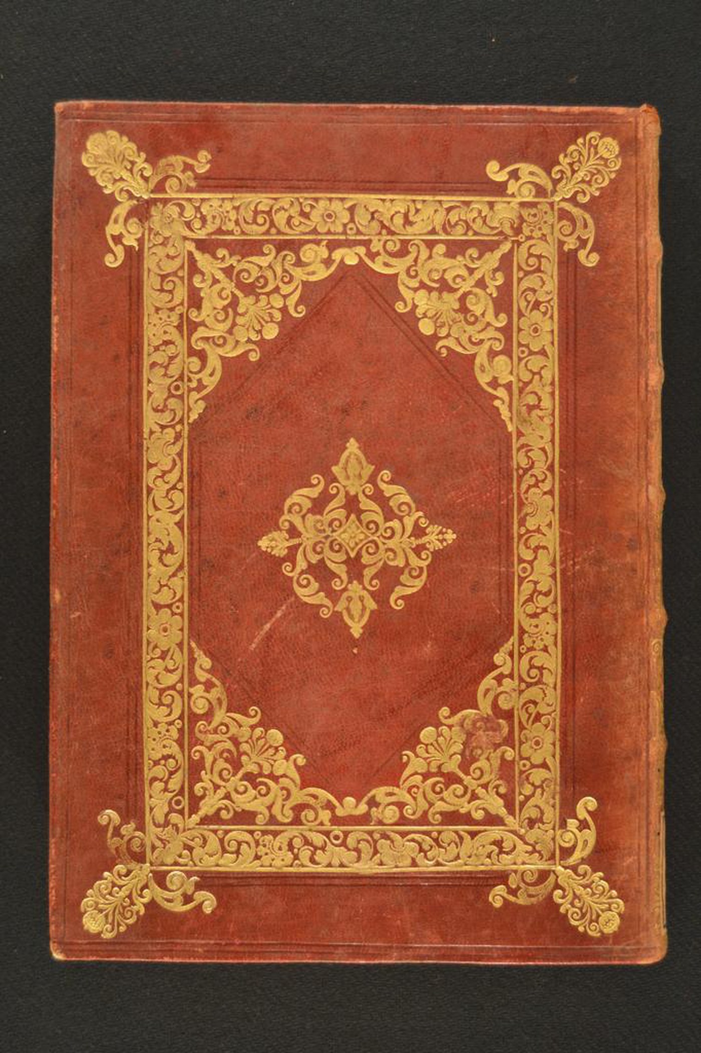 Cuoio di bazzana marrone su quadranti in cartone decorato a secco e in oro. Filetti concentrici. Cornice caratterizzata da fiorami e rami fronzuti mossi. Fogliami nello specchio. Scompartimenti del dorso riquadrati. Nel secondo, il cognome dell’autore e il titolo dell’opera; due volute caudate negli angoli interni e fregio stilizzato centrale in quelli residui. Capitelli muniti di anima circolare avvolta da fili in canapa e in seta verde. Cucitura su cinque nervi rilevati. Indorsatura realizzata tramite alette orizzontali cartacee. Labbri ornati con fregi fitomorfi. Rimbocchi accuratamente rifilati. Contropiatti rivestiti da foglio di carta marmorizzata policroma pettinata. Carte di guardia bianche. Tagli dorati e incisi. Stato di conservazione: discreto. Bruniture e spellature al materiale di copertura dalla tonalità scolorita lungo il dorso. Piatto anteriore lievemente convesso.