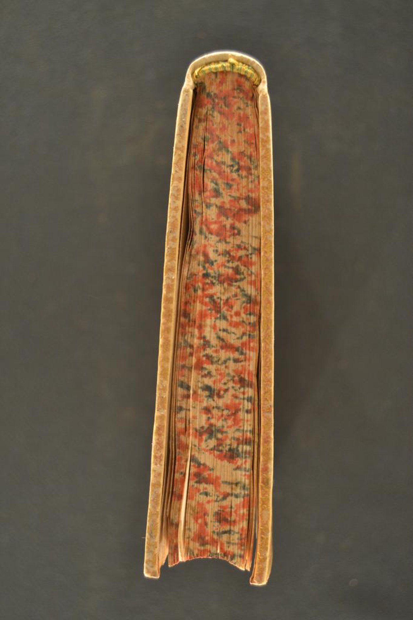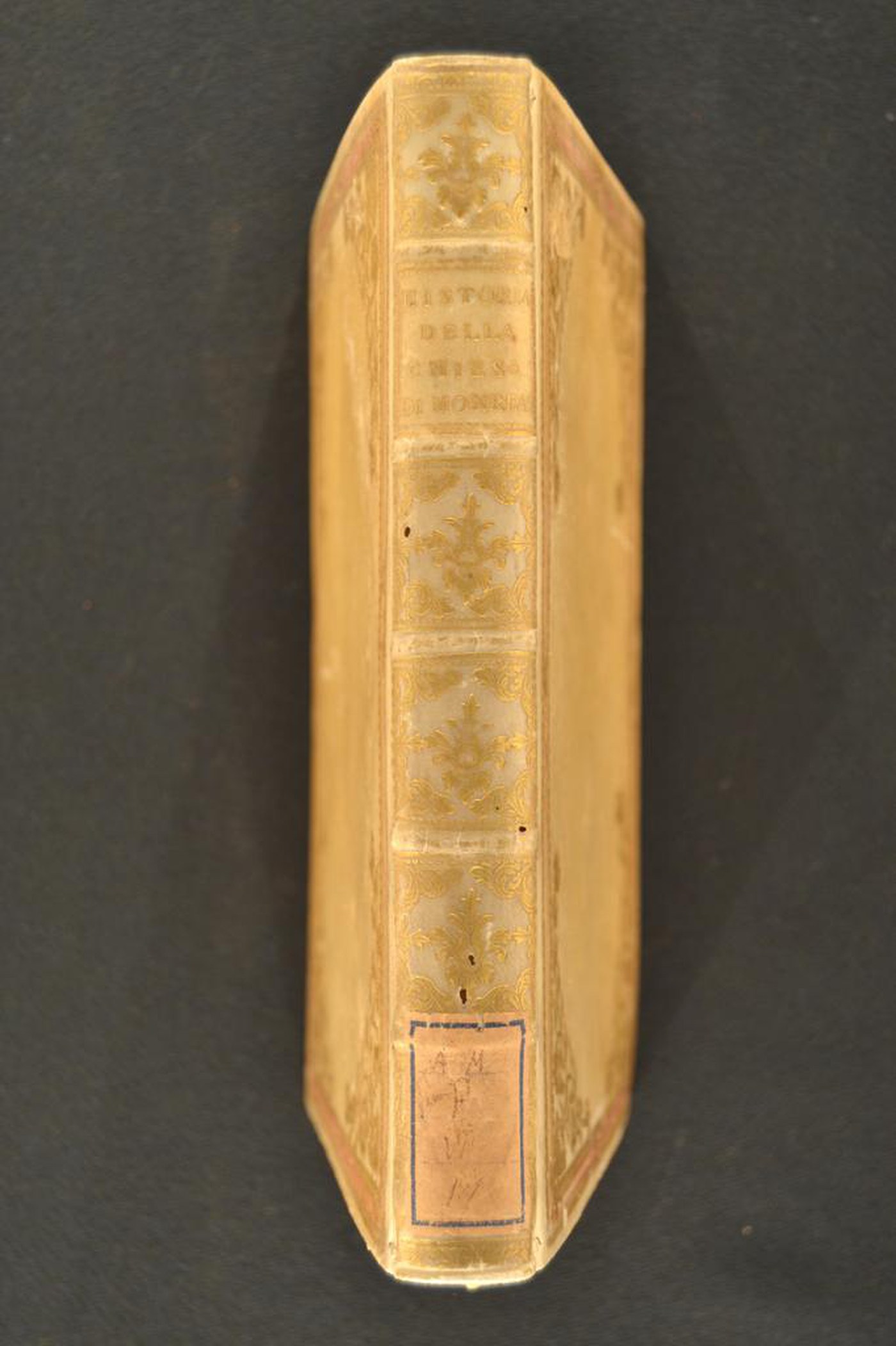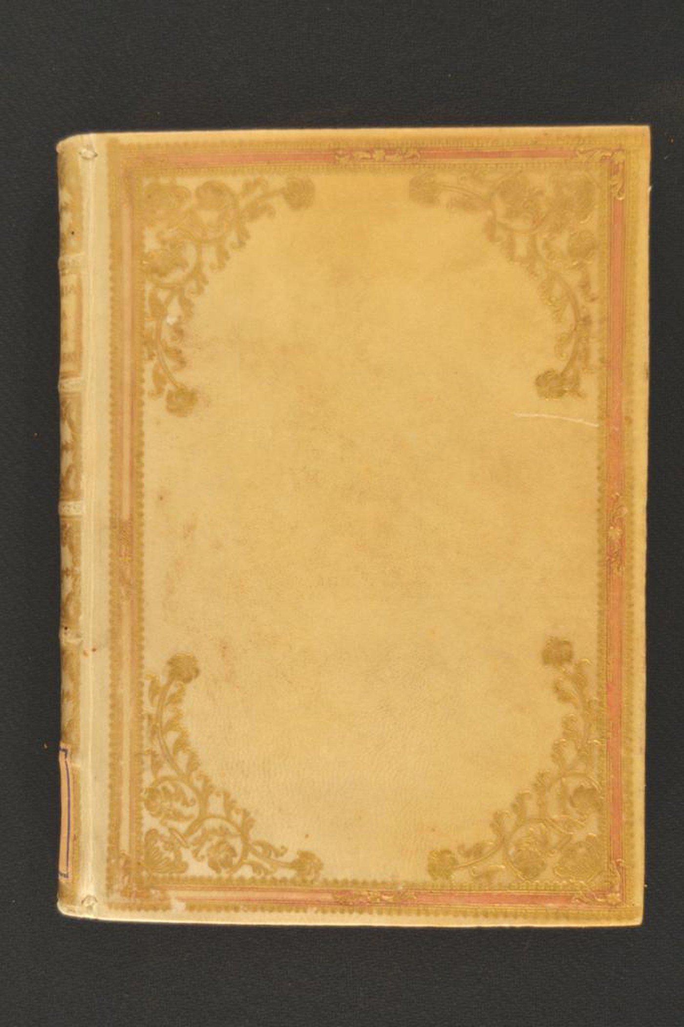 L’impianto ornamentale, i fregi propongono di assegnare la legatura alla prima (?) metà del XVIII secolo, eseguita a Roma. In evidenza l’aletta in foggia di trapezio di transalpina memoria e i tagli policromi, a contrastare la tonalità avoriata monocroma del materiale di copertura.